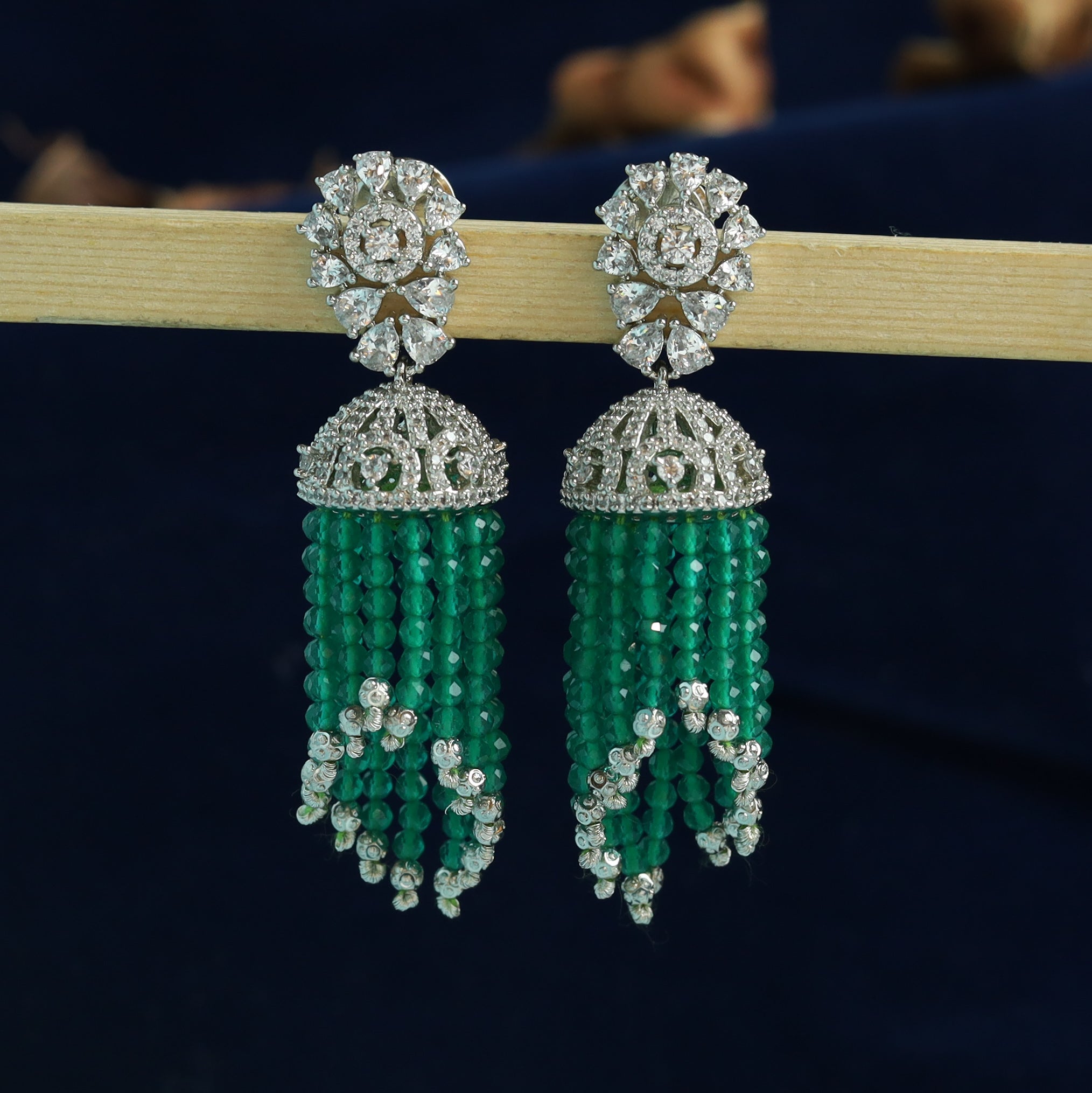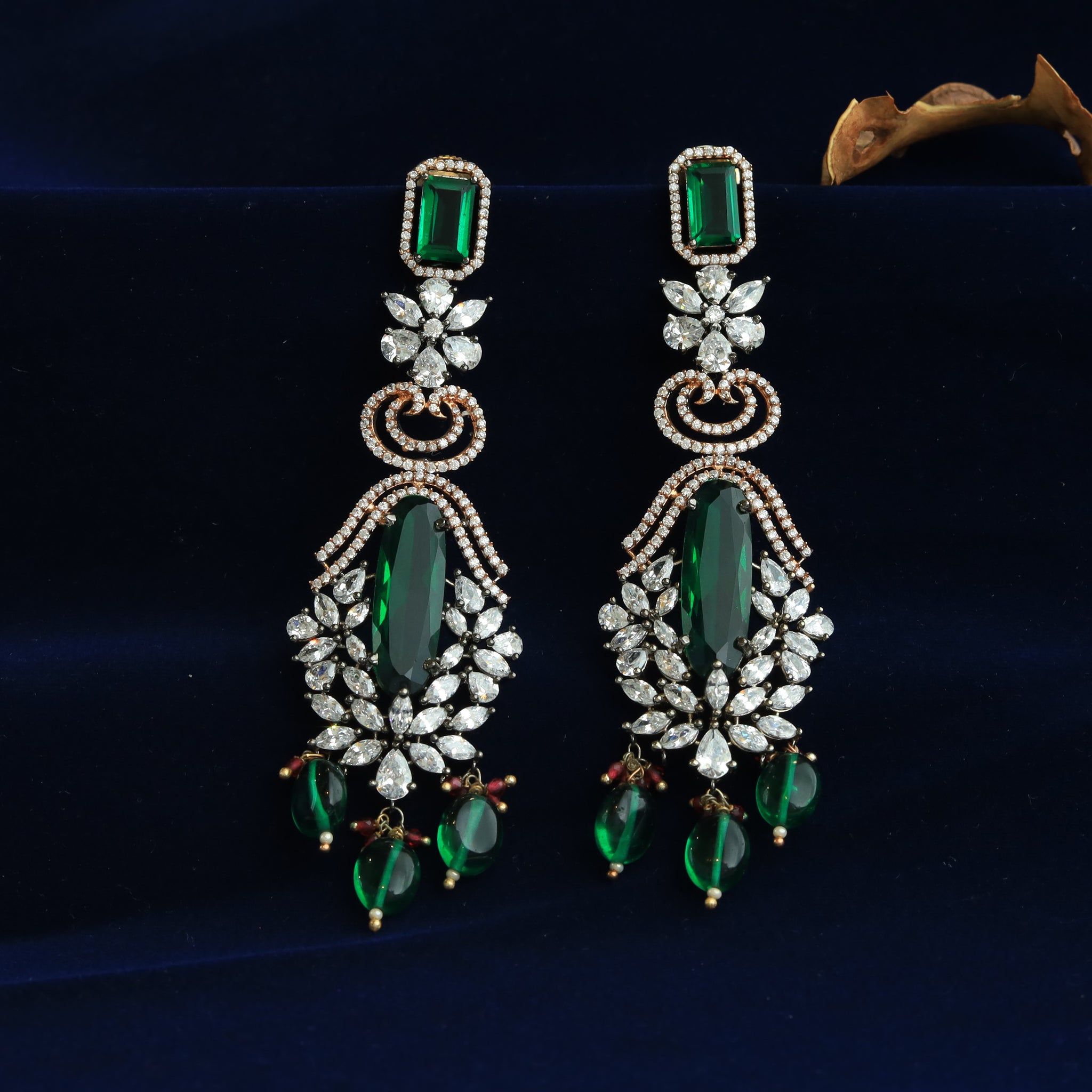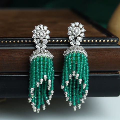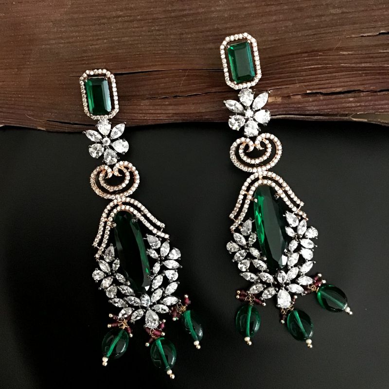 Stone - CZ ( American Diamond), Emerald Earring Closure - Push Back Kannauti Included - No Base - Silver & Copper Alloy  Height - 9.5 CM , Width - 2.7 CM Weight - 28 Grams ( 14gm...