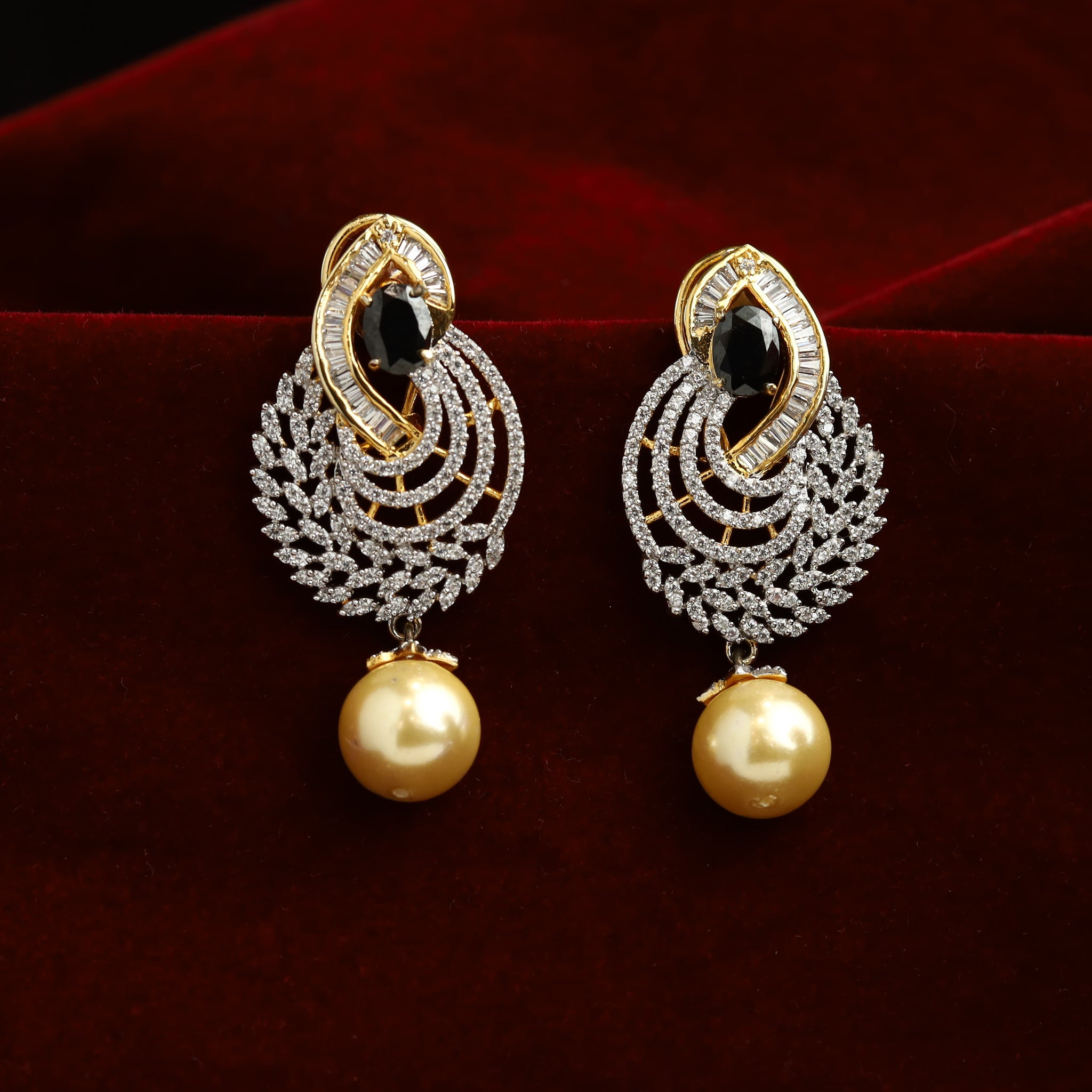 Earring Closure - Spring Clasp & Push Back Stone - CZ (American Diamond), Pearl Base - Silver & Copper Alloy Height - 6 CM, Width - 3 CM Weight- 28 Grams( 14 Grams Each Earring)...