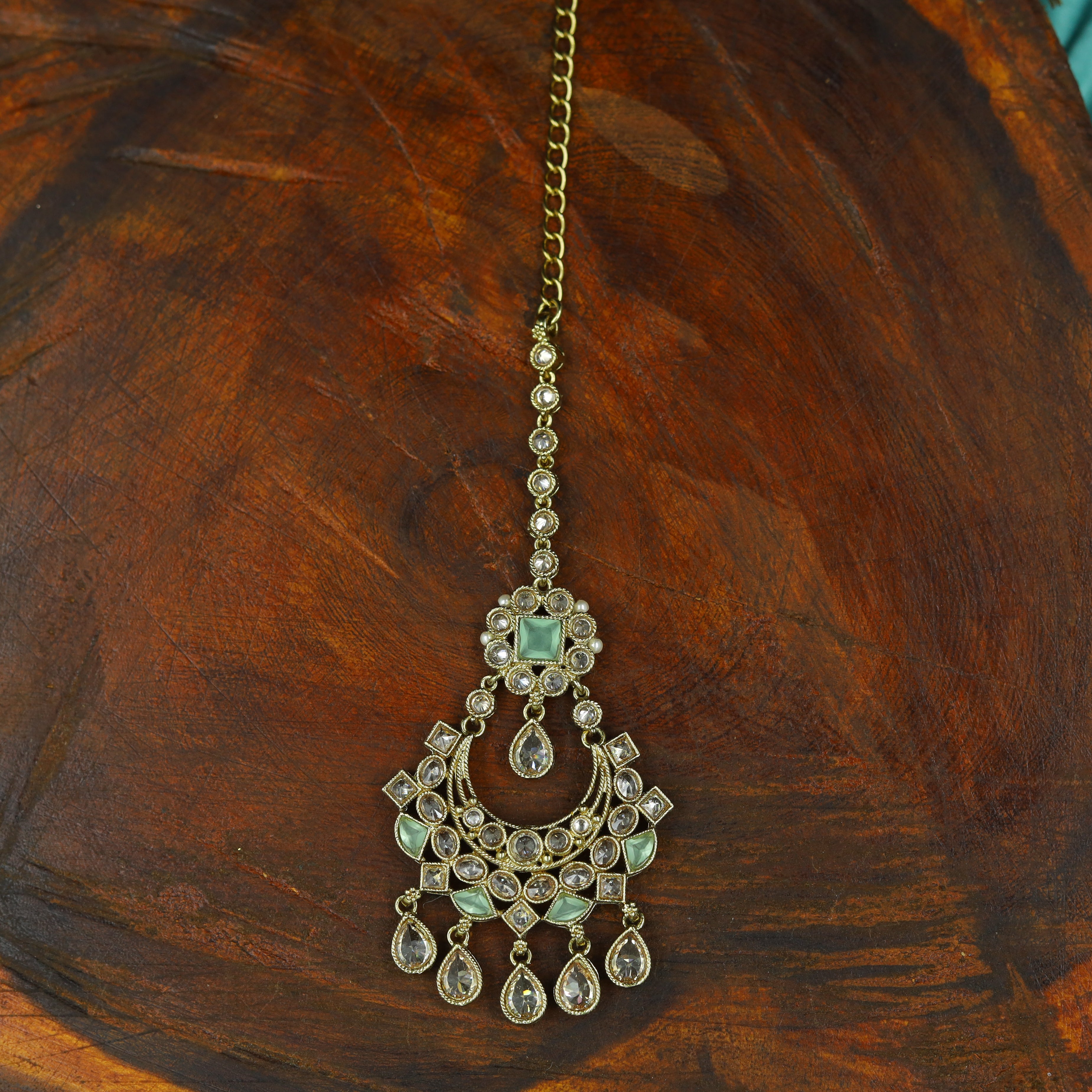 The intricate design of this choker is further enhanced by its stunning Chandbali style earrings and Mangtikka. The Chandbali earrings feature a beautiful crescent moon shape with intricate polki detailing and are perfect for adding a touch of glamour to any outfit. The Mangtikka is a stunning headpiece that adds a regal touch to the overall look.