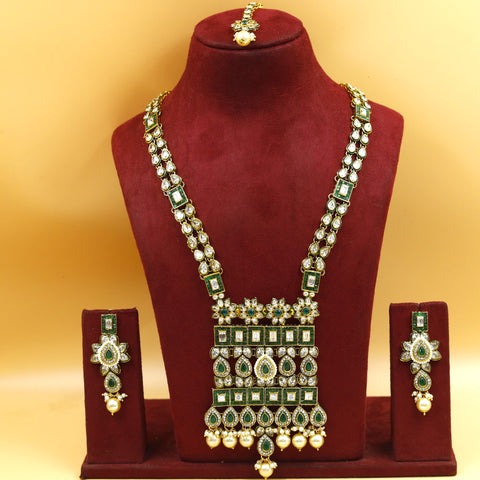 Set Contains - 1 Choker + 1 long Necklace + 1 Maang tikka + 1 Matha patti + 1 Passa + 2 Hathphool + 2 Earrings + 1 Nath Stone - Kundan, Pearl Base -...