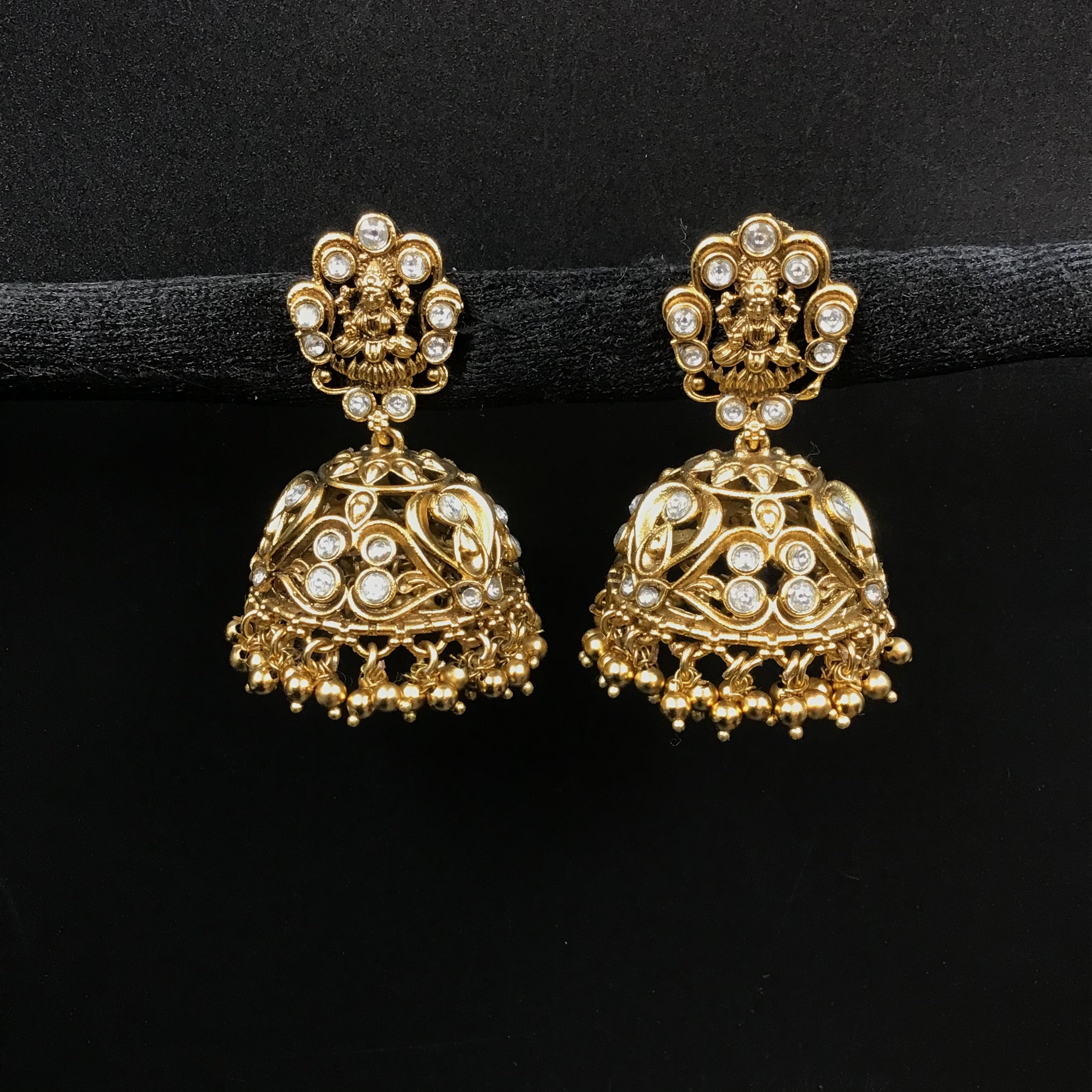 Antique Temple Jhumki earrings feature delicate pearls and kundan stones, arranged in an intricate design that is both timeless and versatile. The earrings are made of high-quality metal that has been given a lustrous gold polish, creating a stunning contrast with the white pearls and sparkling kundan stones.