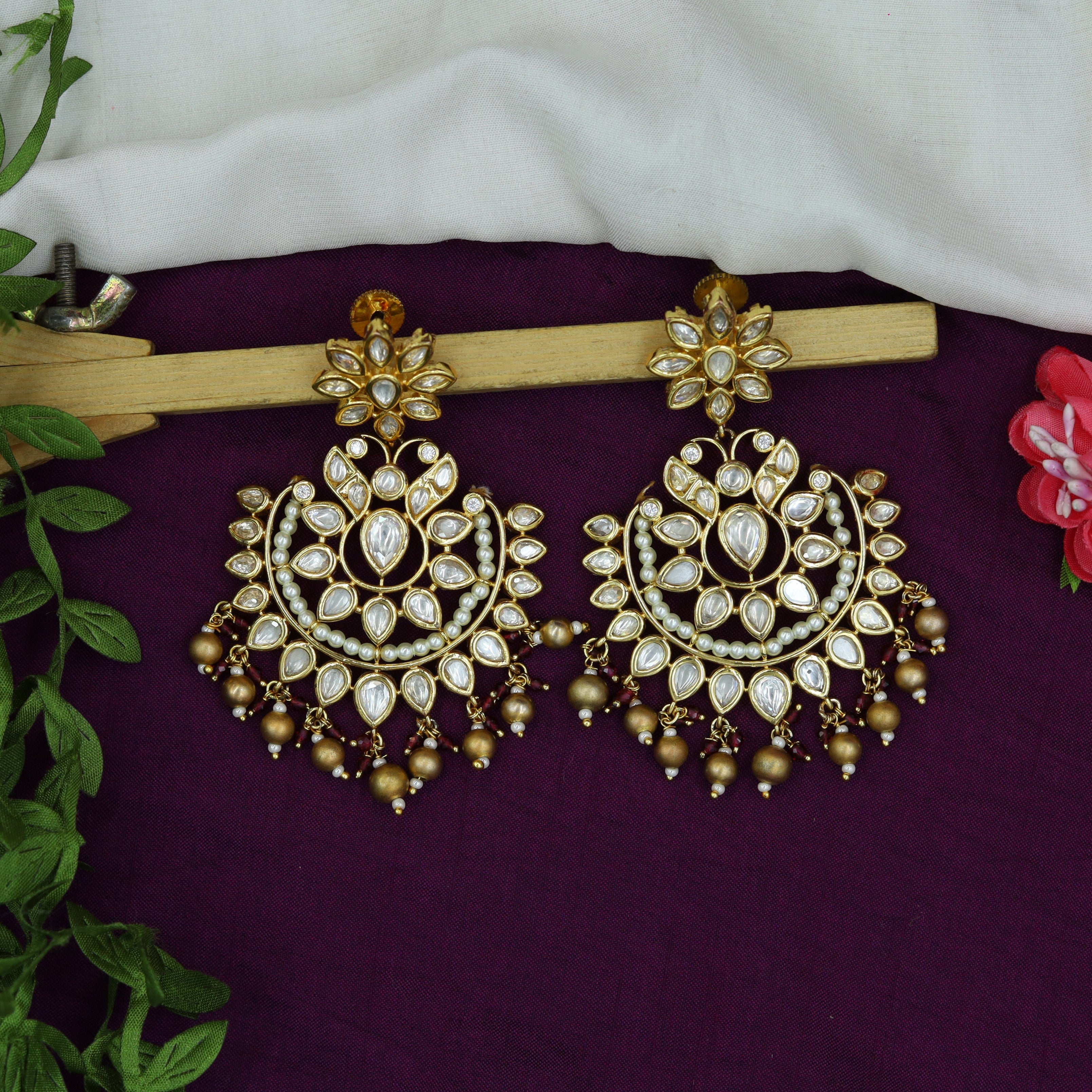 The earrings feature a combination of Ruby Kundan, white and ruby and Gold beads, and fine stones. The Ruby Kundan is a type of Indian gemstone that is known for its rich red color and unique texture. It is typically used in traditional Indian jewelry and adds a touch of elegance and sophistication to any design.