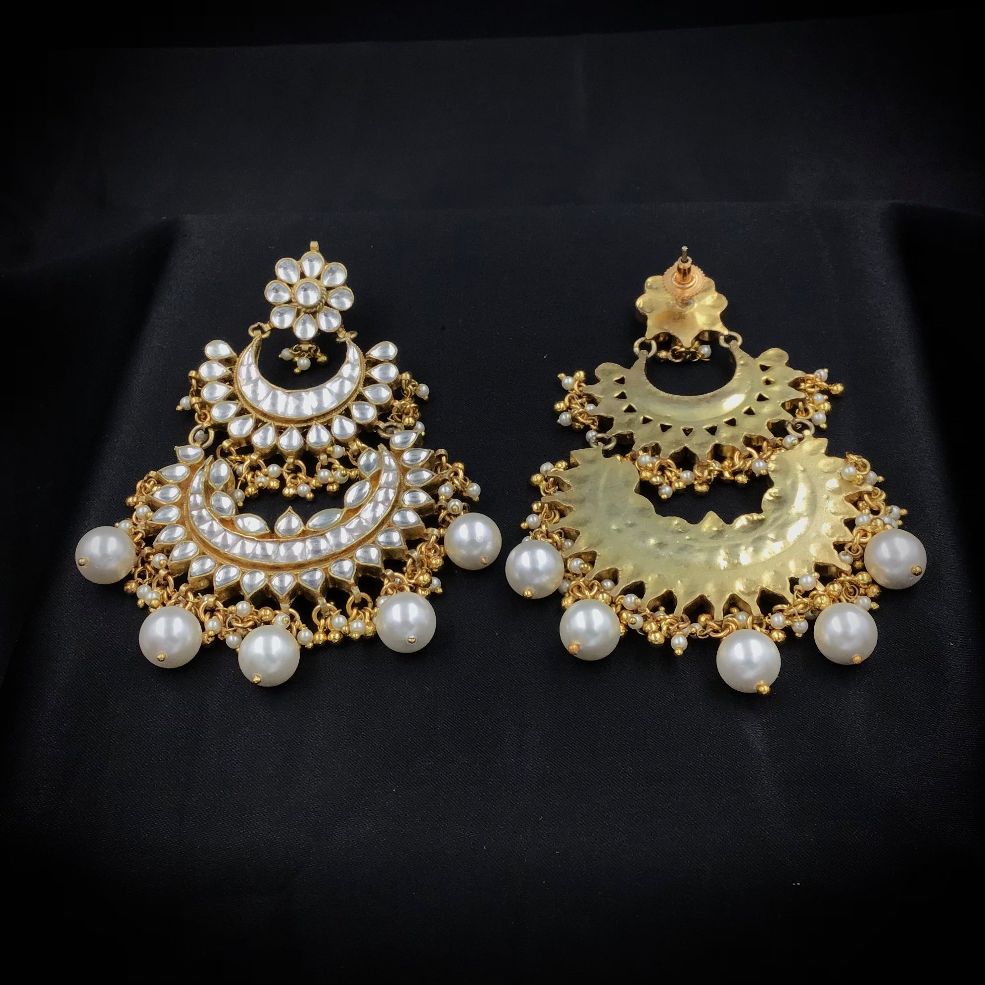 The breathtaking Kundan Chandbali with White Beads used as a latkan, adorned with exquisite Pachi Kundan work, a true epitome of elegance and regal beauty. These earrings seamlessly blend the intricate craftsmanship of Kundan with the captivating allure of Pachi work, creating a masterpiece that will leave a lasting impression.