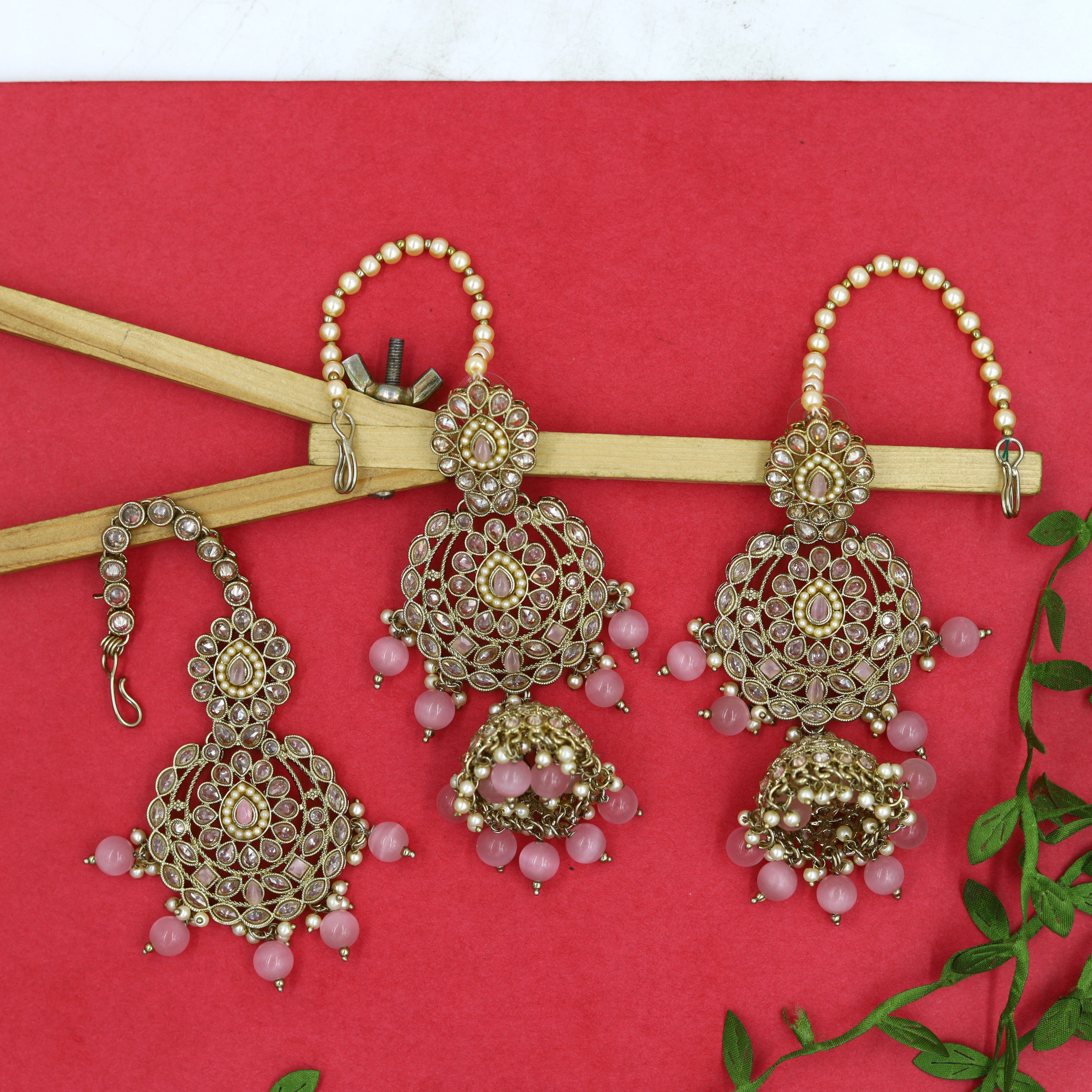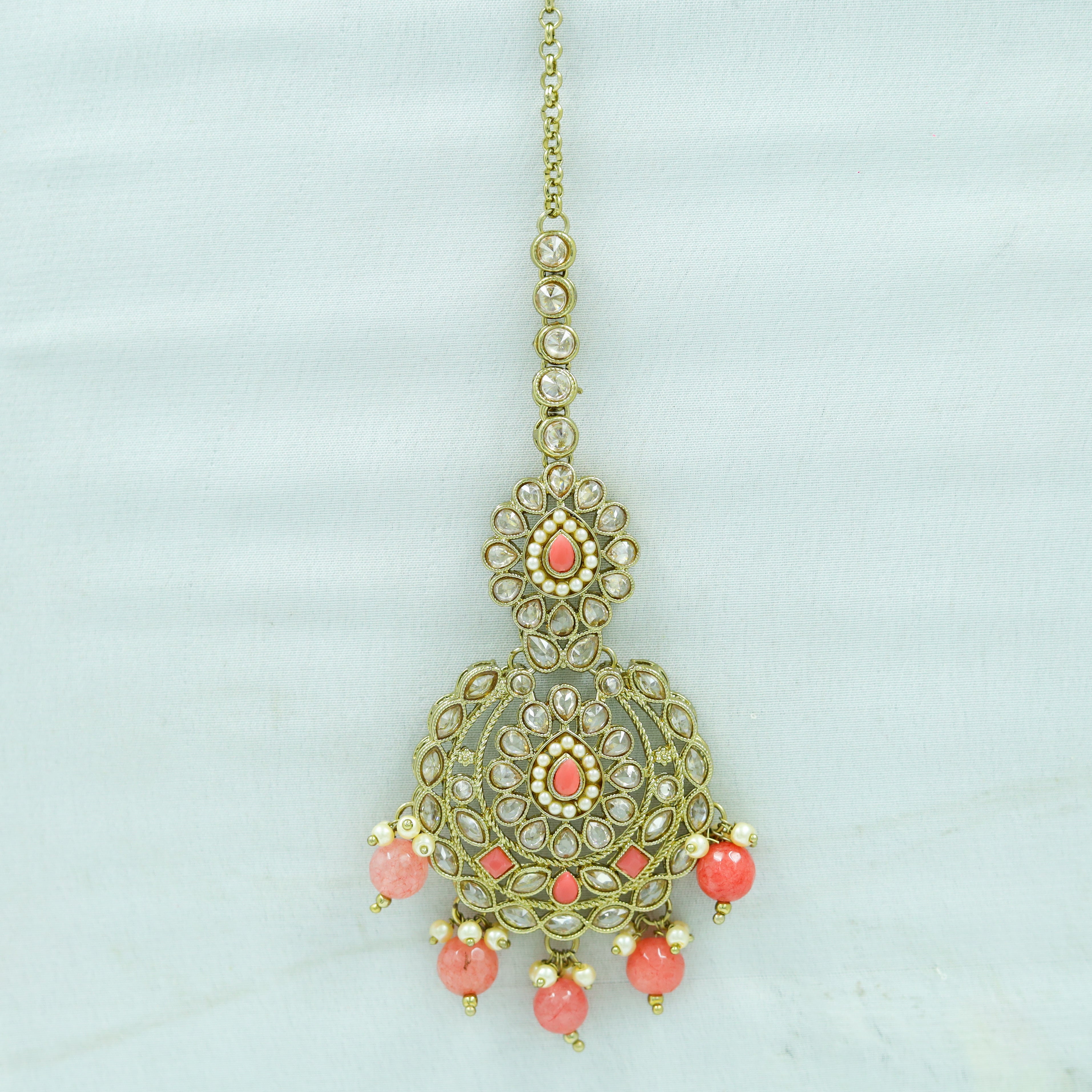 Our exquisite Antique Polki Mangtikka and Earring set, crafted with precision and elegance to add a touch of traditional charm to your wardrobe. The set comes with a beautifully designed Mangtikka and three options for earrings in Dark Pink, Yellow, and Pink to match your attire.