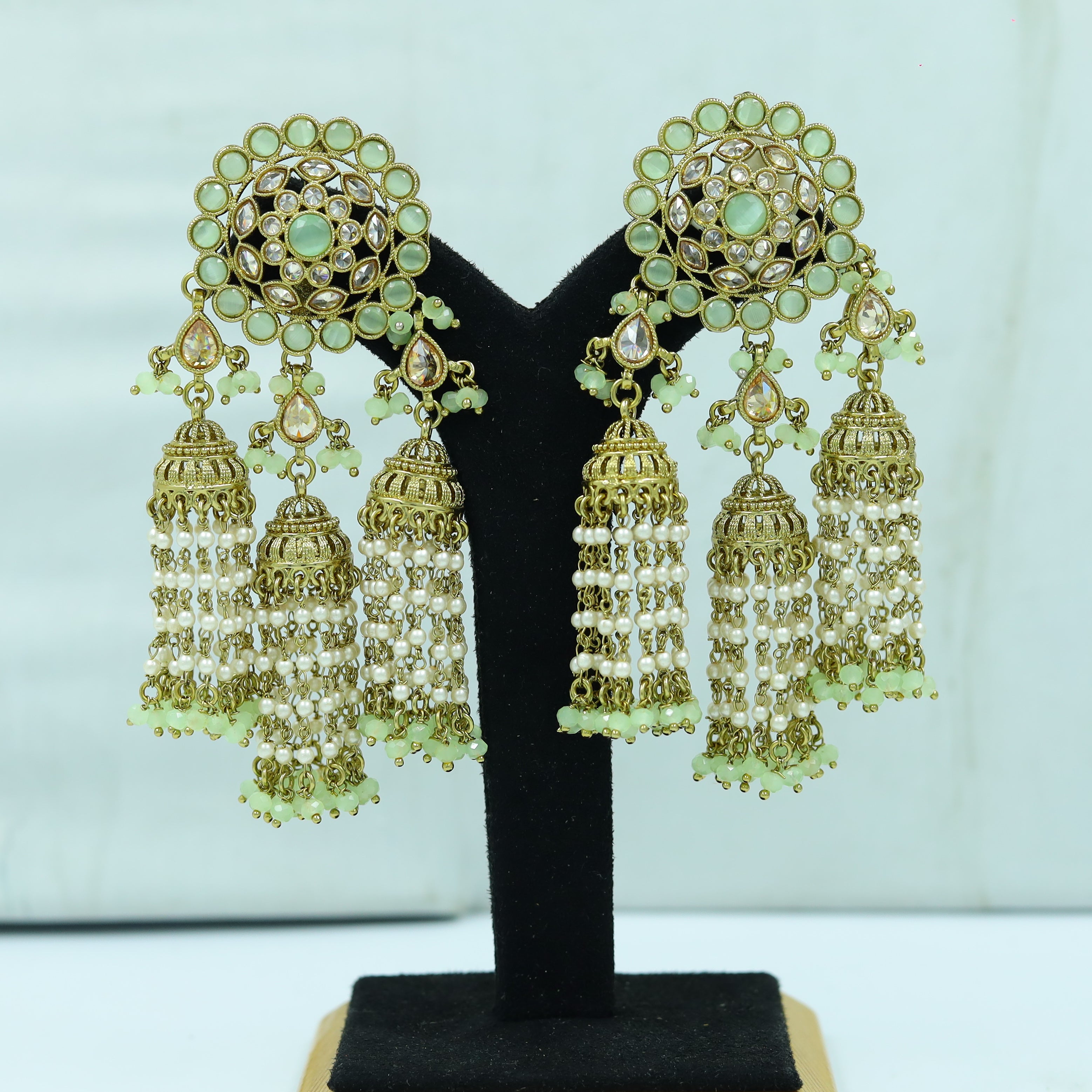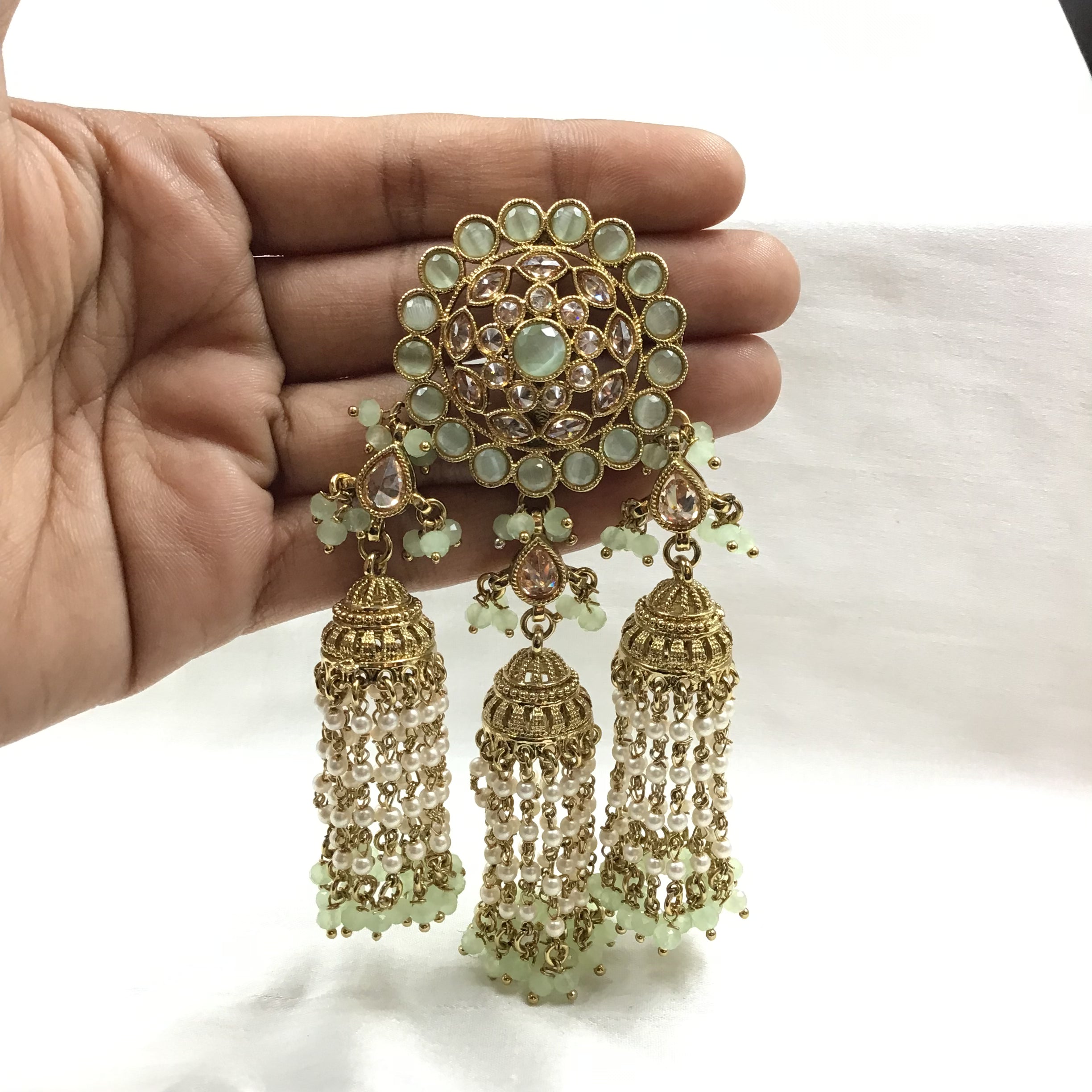 The Antique Polki Jhumki, a stunning piece of jewelry that combines traditional design with modern elements to create a unique and elegant look. This exquisite jhumki features beautiful mint green stones that add a touch of freshness and vitality to the piece.