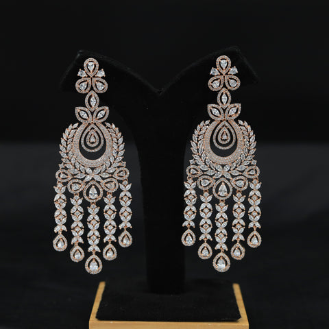 Type - DanglersStone - CZ ( American Diamond)Polish - Rose GoldEarring Closure - Push BackKannauti Included - NoBase - Silver & Copper Alloy Height - 10 CM Â , Width - 2.1 CMÂ Weight - 40...