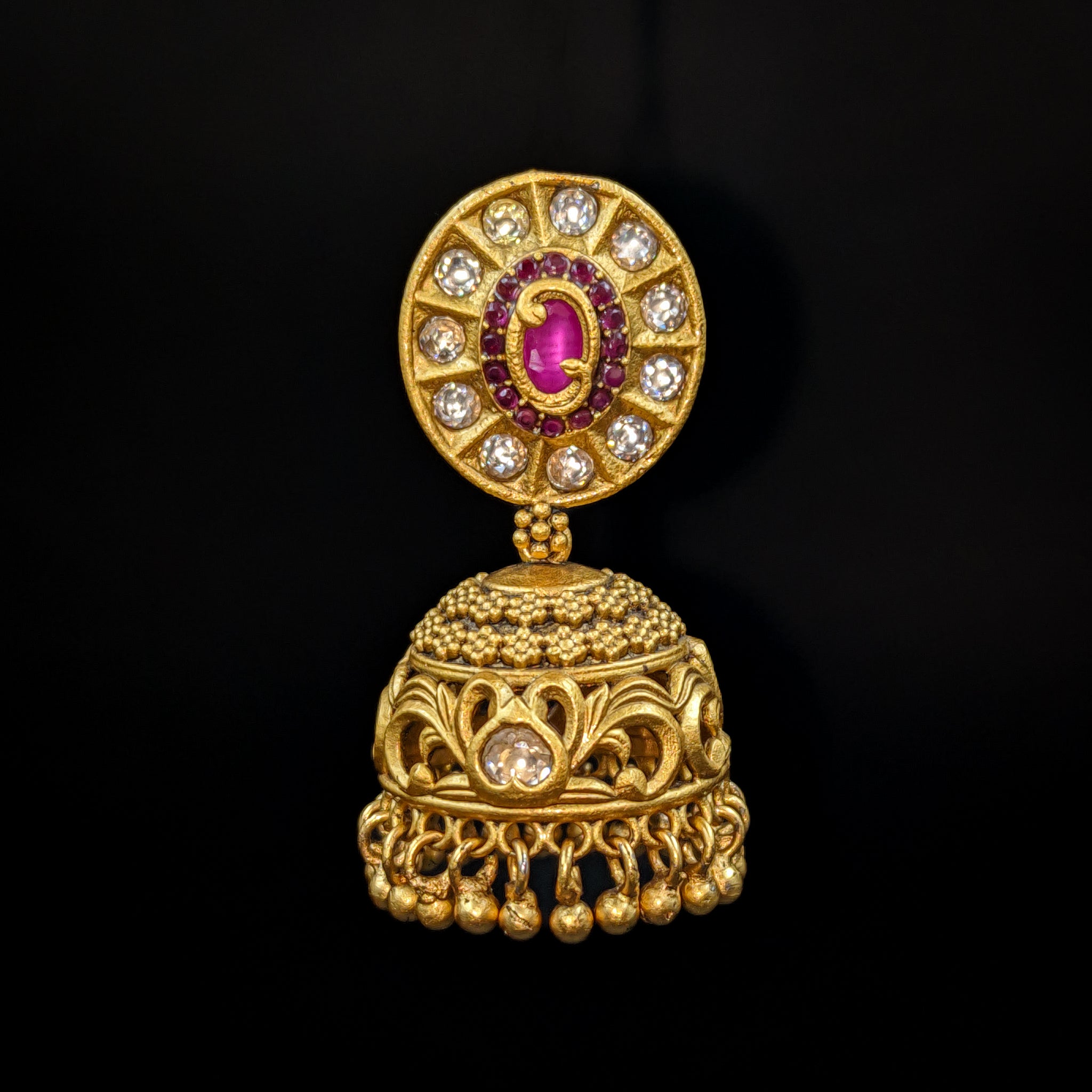 The stunning Gold Look Jhumki with Ruby Stone, White Stone, and Golden Beads, designed to add a touch of elegance and sophistication to your look. These lightweight Jhumkis are perfect for wearing with any dress or color combination, making them a versatile accessory for any occasion.