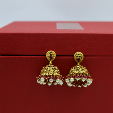 Base - Silver & Copper AlloyEarring Closure - Push Back The stunning Gold Look Jhumki with Ruby Stone, White Stone, and Golden Beads, designed to add a touch of elegance and sophistication to your look....