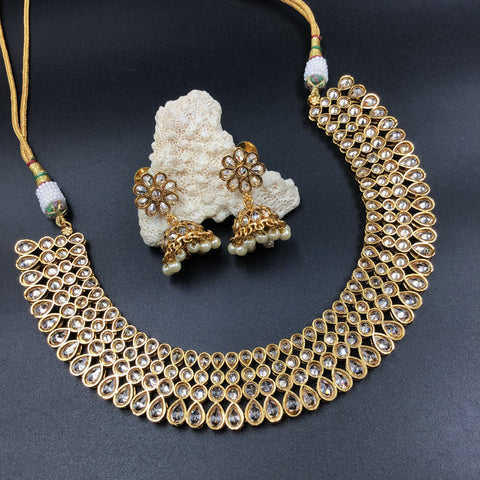 Type - Choker Stone - Pearl Polish - Gold Color - Champagne Necklace Closure - Silk Dori Earring Type - ChandbaliEarring Closure - Push BackBase - Copper Silver alloy Necklace Contains - 1 Necklace + 2 Earrings Earring:...