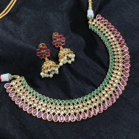 Type - ChokerStone - Kundan, RubyPolish - GoldColor - RubyNecklace Closure - Silk DoriEarring Type - JhumkiEarring Closure - Push BackBase - Copper Silver alloyNecklace Contains - 1 Necklace + 2 Earrings Earring: Height- 5.7 cm...