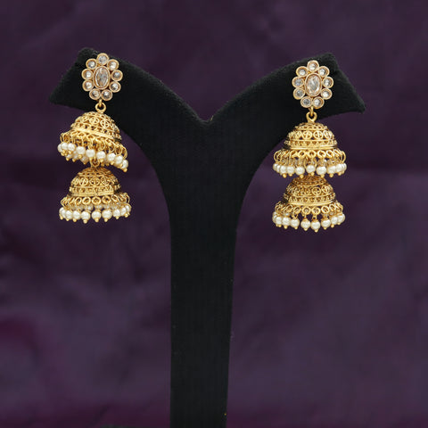 Earring Closure - Push BackBase - Silver & Copper Alloy Height - 7.5 CM , Â Width - 1.9 CM Weight - 40 Grams(20gm per Earring) Our elegant and unique Gold Look Designer Jhumki with White...