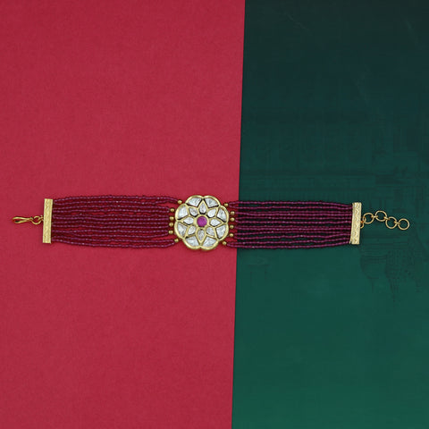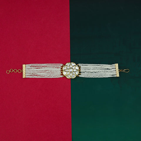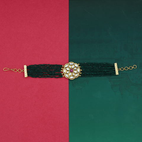 Base - Silver & Copper AlloyPolish - Gold Our stunning Kundan Beaded Bracelet, a true masterpiece of design and craftsmanship. This bracelet features a delicate string of small beads that adds a subtle elegance to...