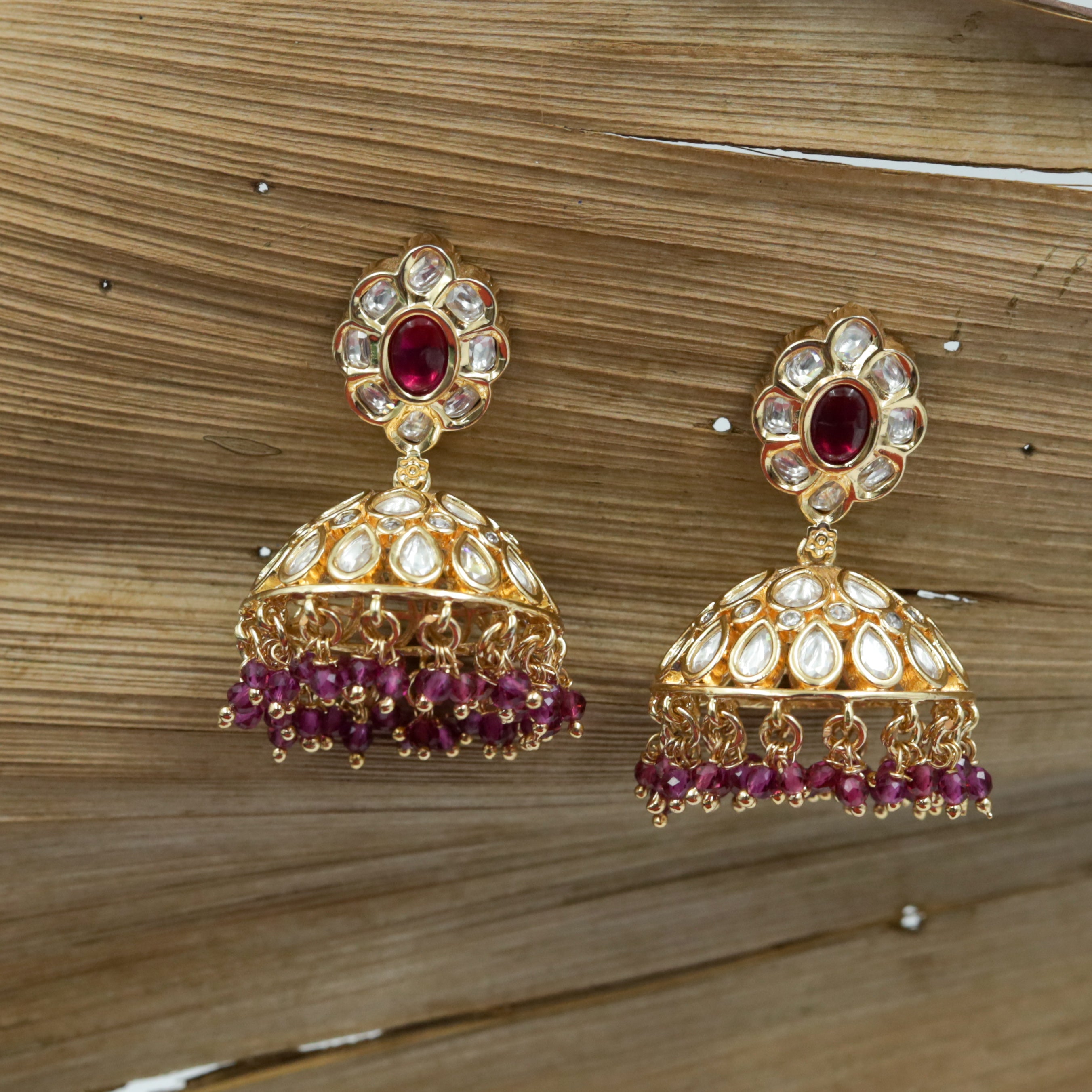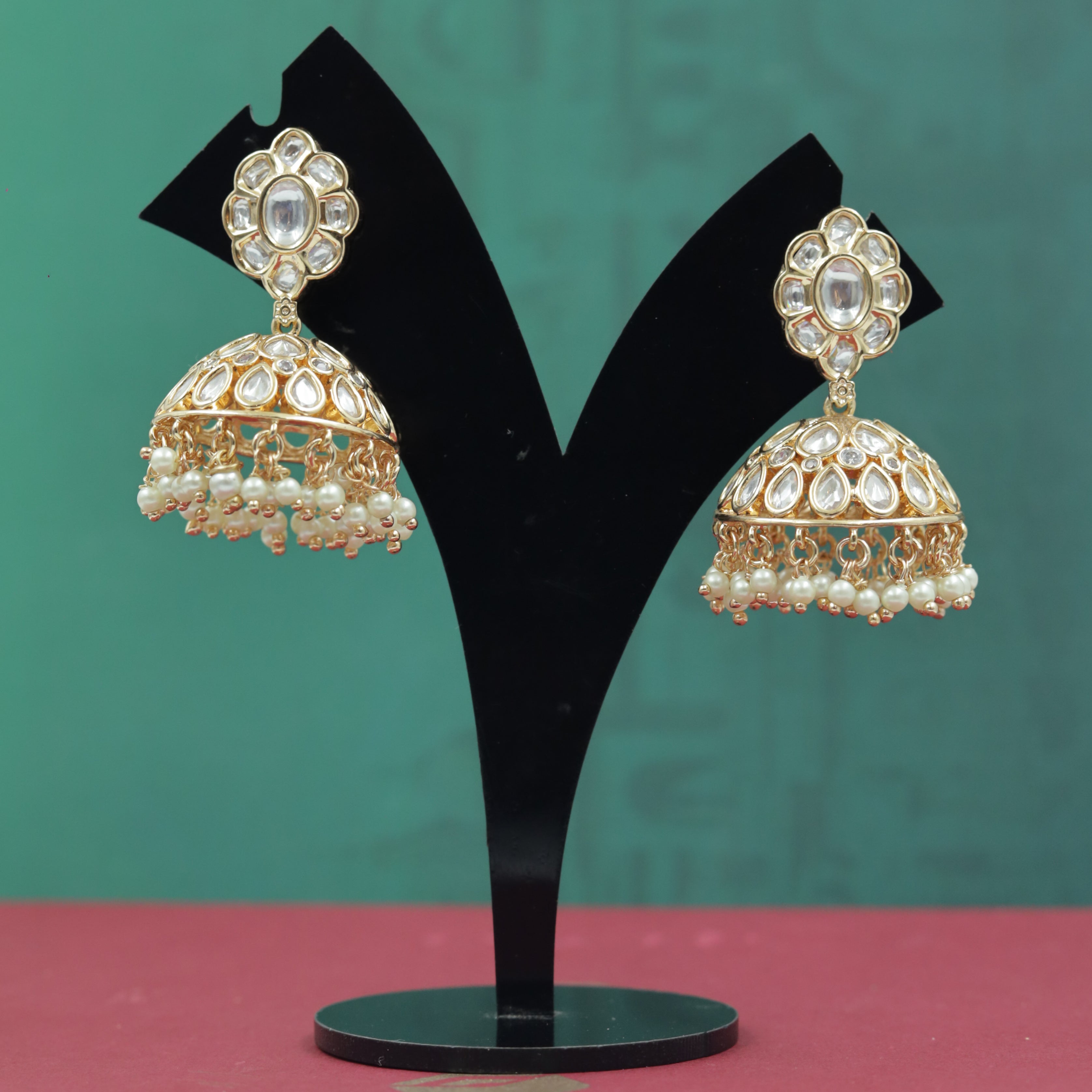 Our enchanting Kundan Jhumki, a true celebration of traditional craftsmanship and timeless beauty. These earrings exude elegance with their intricate Kundan work, reflecting a mesmerizing play of colors. The delicate jhumki bells add a touch of charm, making these earrings a perfect blend of sophistication .