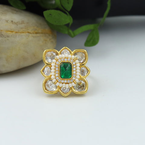 Base - Silver & Copper AlloyPolish - Gold Our exquisite Kundan Ring, a true masterpiece of craftsmanship and elegance. The color stone serves as the centerpiece, radiating a captivating charm that catches the eye and...