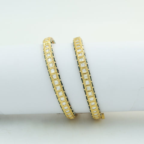 Base - Silver & Copper AlloyOpenable - Yes, screw openablePolish - GoldPack Contains - 2 Bangles Our captivating Square Kundan Bangles, a harmonious blend of tradition and modernity. Adorned with meticulously placed square-shaped Kundan stones,...