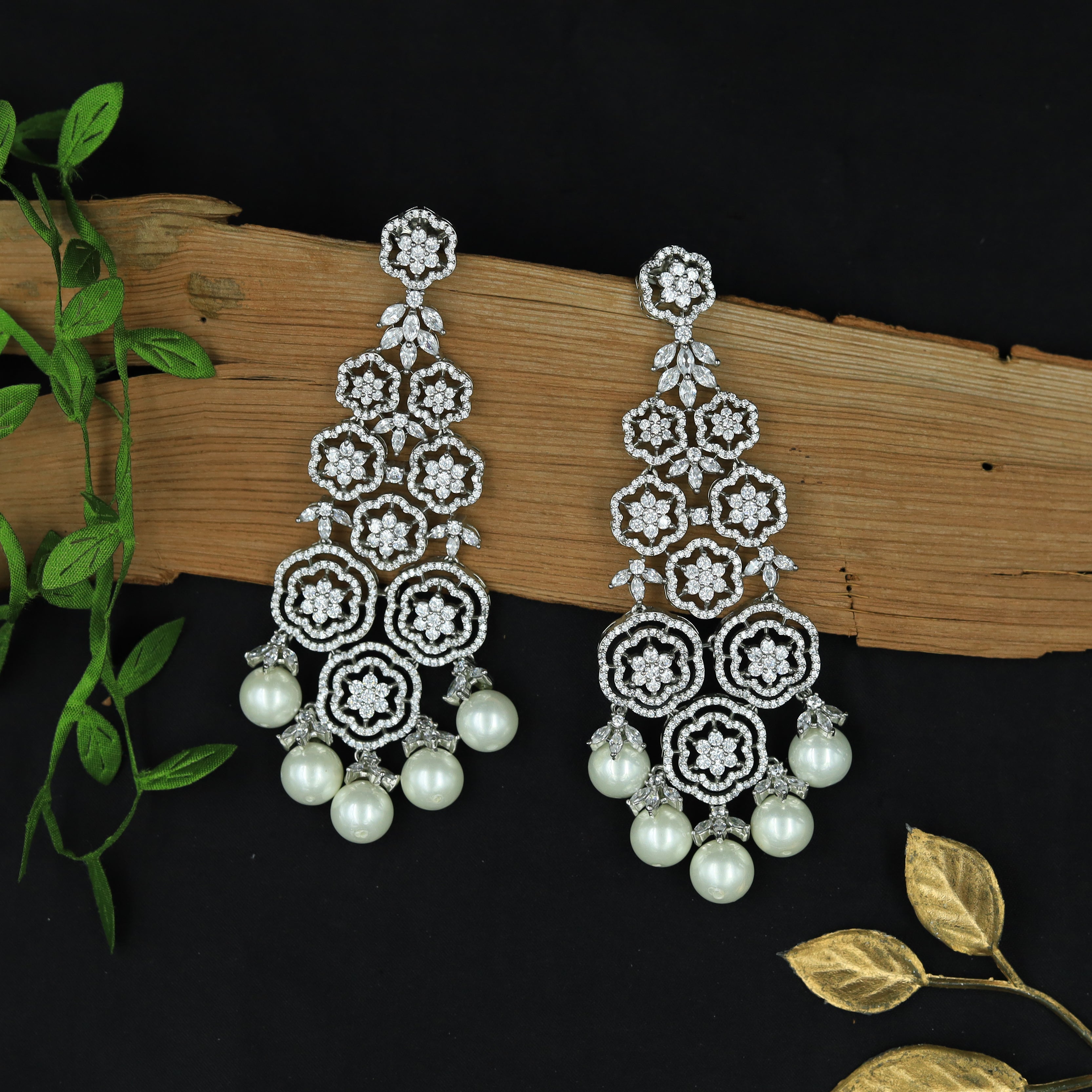 The earrings feature high-quality zircon stones that are expertly prong-set in a beautiful pattern, combined with lustrous white pearls that add a touch of class to the design. The use of these stones and pearls in combination with the silver polish finish creates a beautiful contrast and adds an element of grace and sophistication to the overall design.