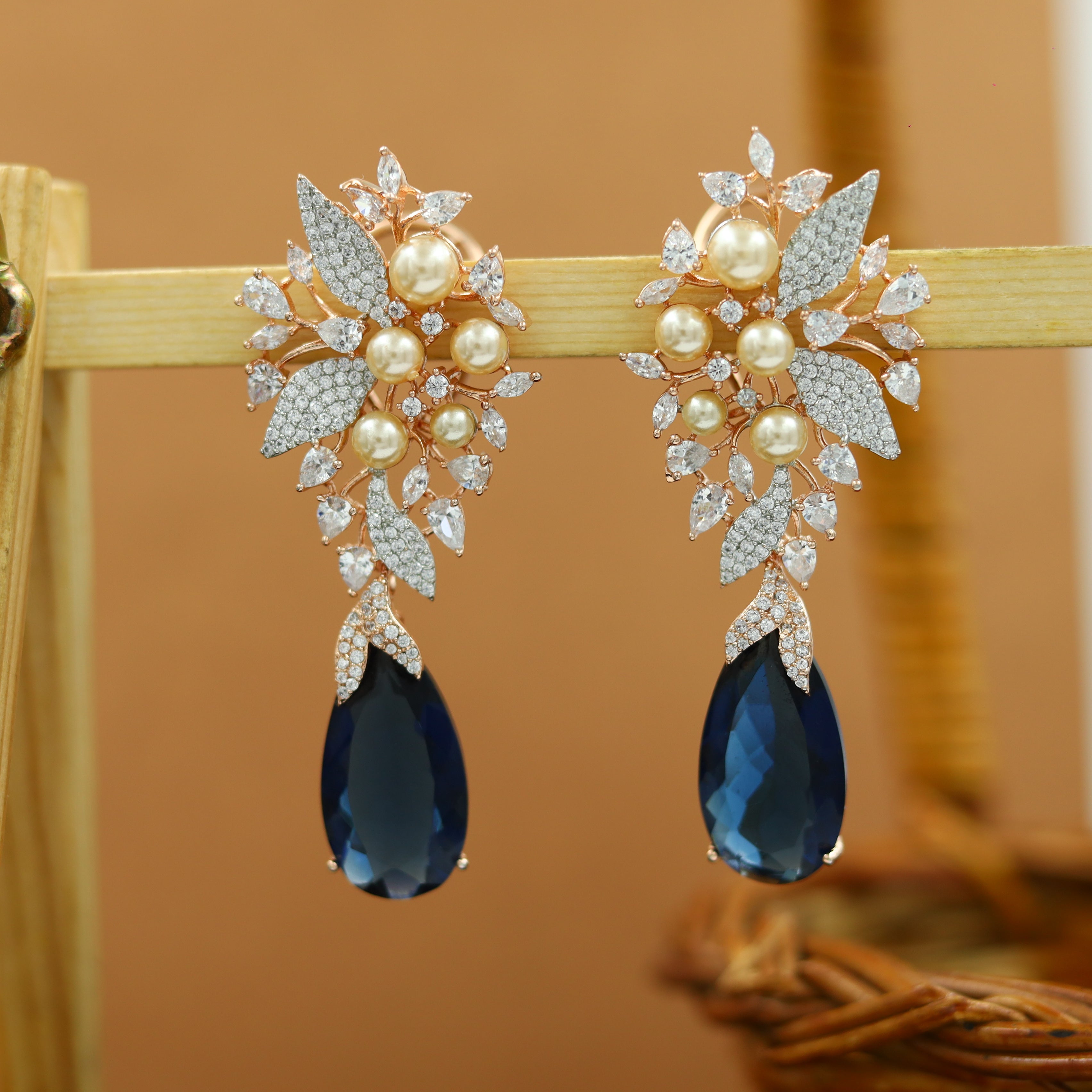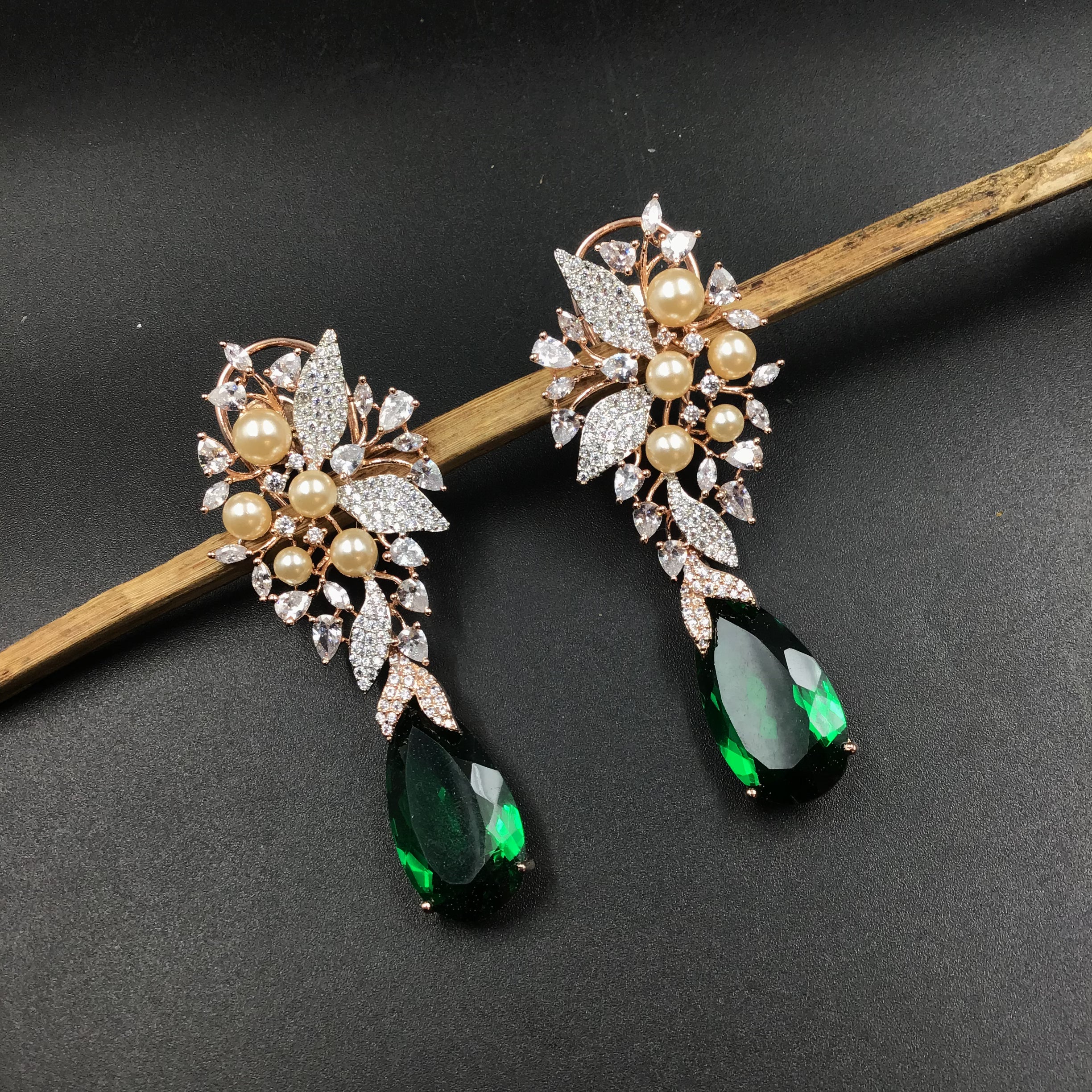 The exquisite Rose Gold Polish Zircon/AD Earring, expertly crafted with intricate details and adorned with a range of different stone colors, including a magnificent fine stone. This earring is a true masterpiece, designed to capture the essence of modern elegance and style.