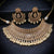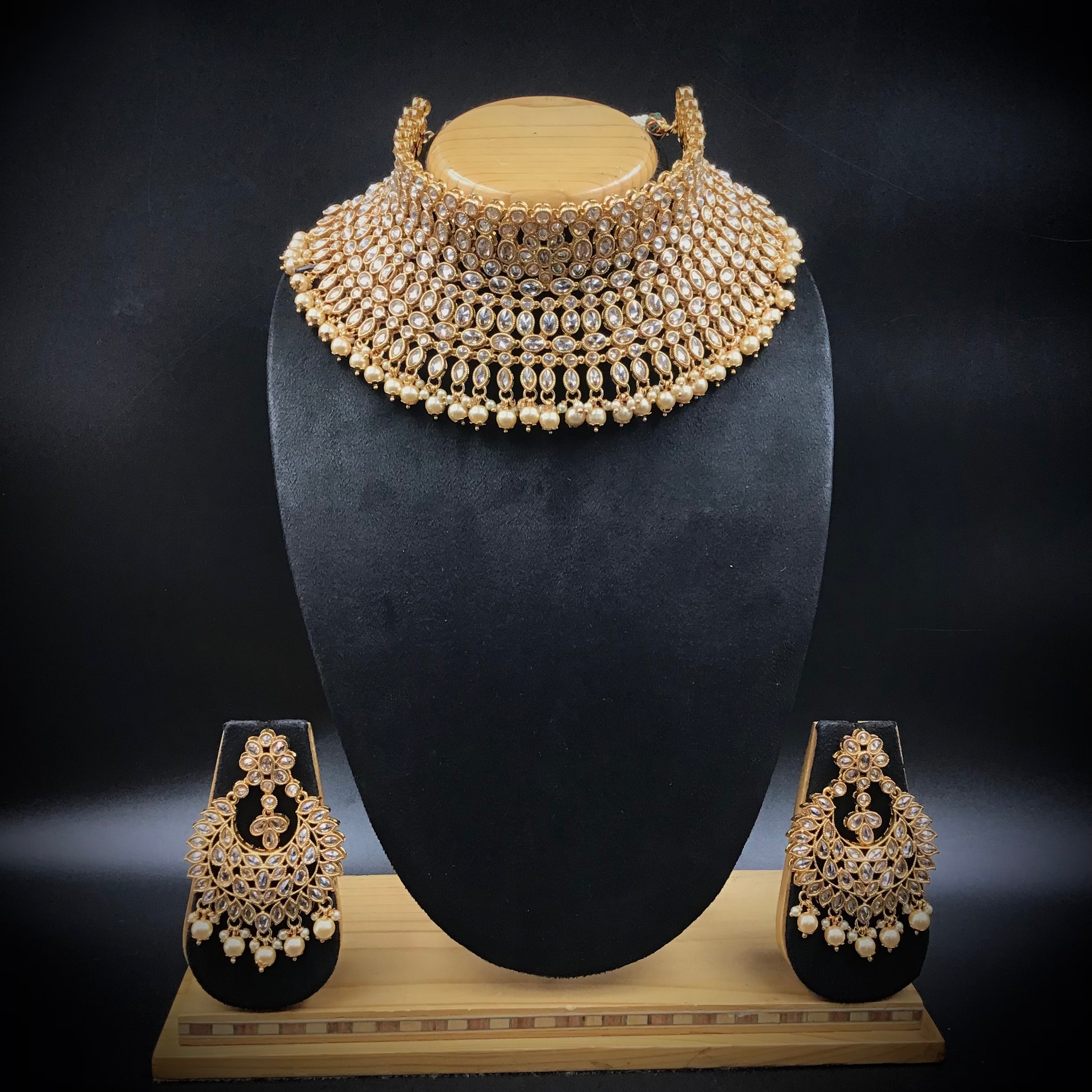 This elegant choker is designed in the traditional Chandbali style, with intricate detailing that is sure to leave you in awe.The accompanying Chandbali style earrings and Mangtikka are also adorned with the same beautiful design, adding a touch of grace to your overall bridal look. The Polki choker set is perfect for your big day, and will leave everyone mesmerized with its beauty.