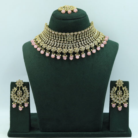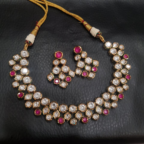 Set Contains - 1 Necklace + 2 EarringsNecklace Closure - Silk DoriEarring Closure - Push BackBase - Silver & Copper Alloy Our exquisite Gold Look Long necklace featuring a combination of white and pink stones,...