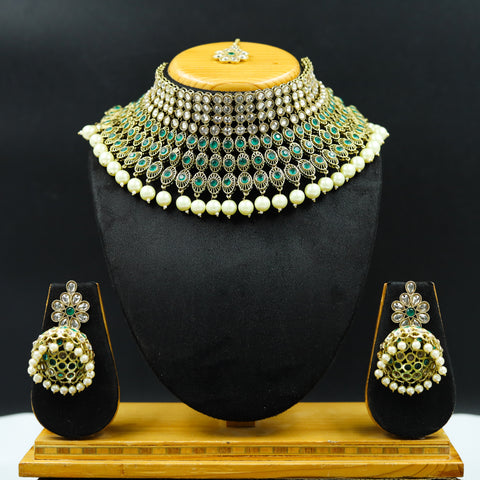 Set Contains - 1 Necklace + 2 Earrings+ 1 Maang TikkaNecklace Closure - Silk DoriEarring Closure - Push BackBase - Silver & Copper Alloy This elegant choker is designed in the traditional Chandbali style, with...