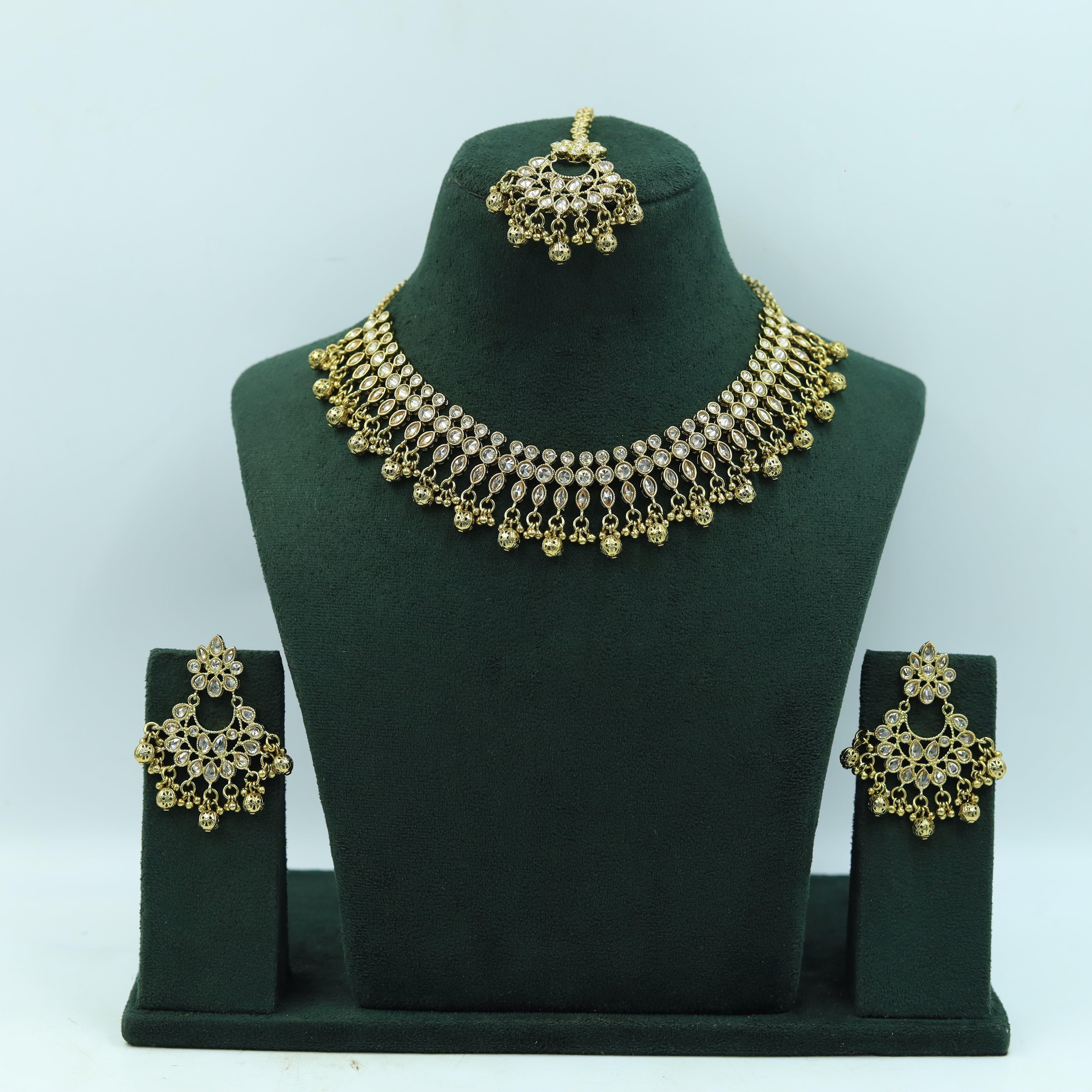 Set Contains - 1 Necklace + 2 Earrings 1 Mang Tika Earring Closure - Push BackNecklace Closure - Silk DoriBase - Silver & Copper Alloy