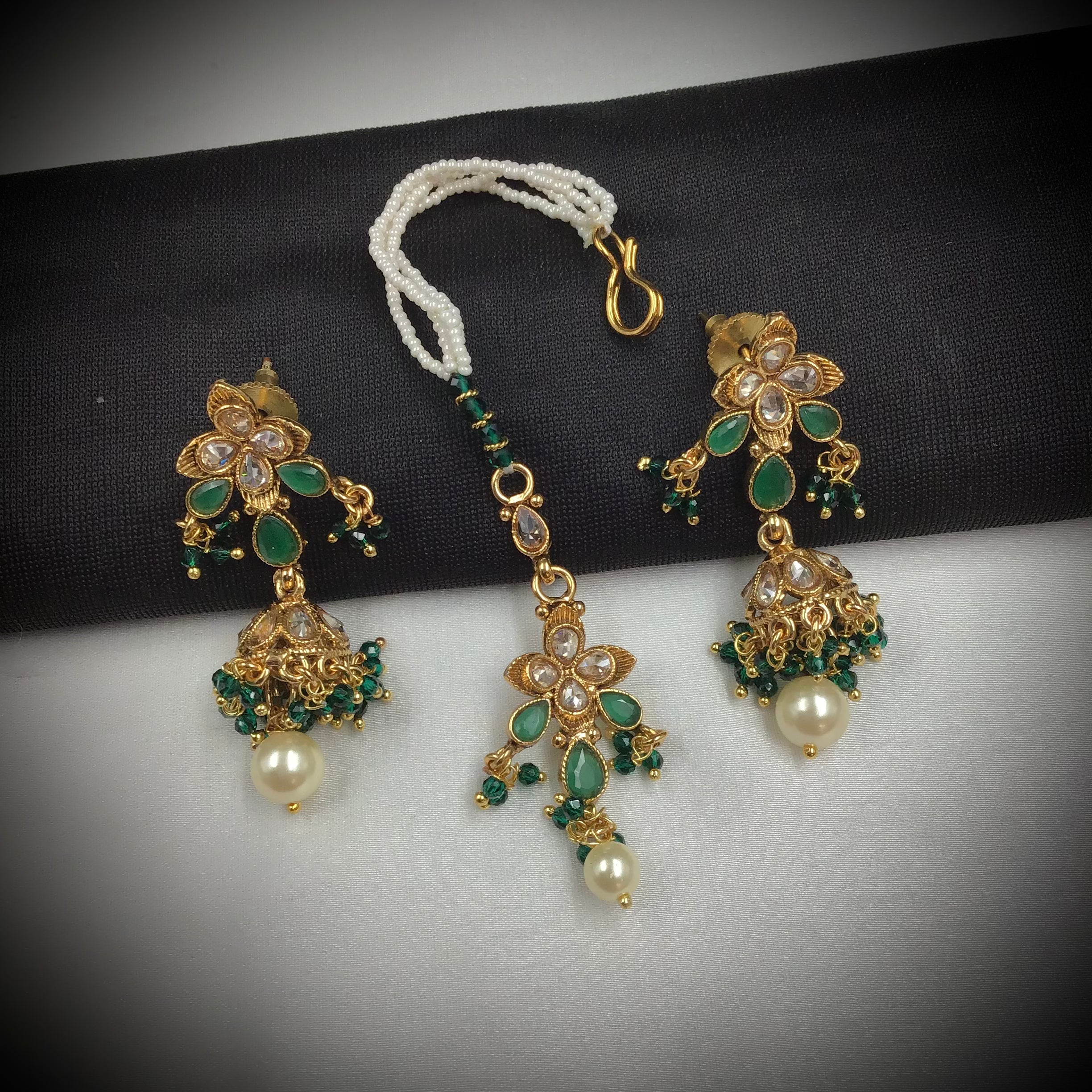 The small green and white beads are strung together to create a unique string that complements the green stones perfectly. The big off-white pearl latkan adds a touch of sophistication and complements the entire piece beautifully.
