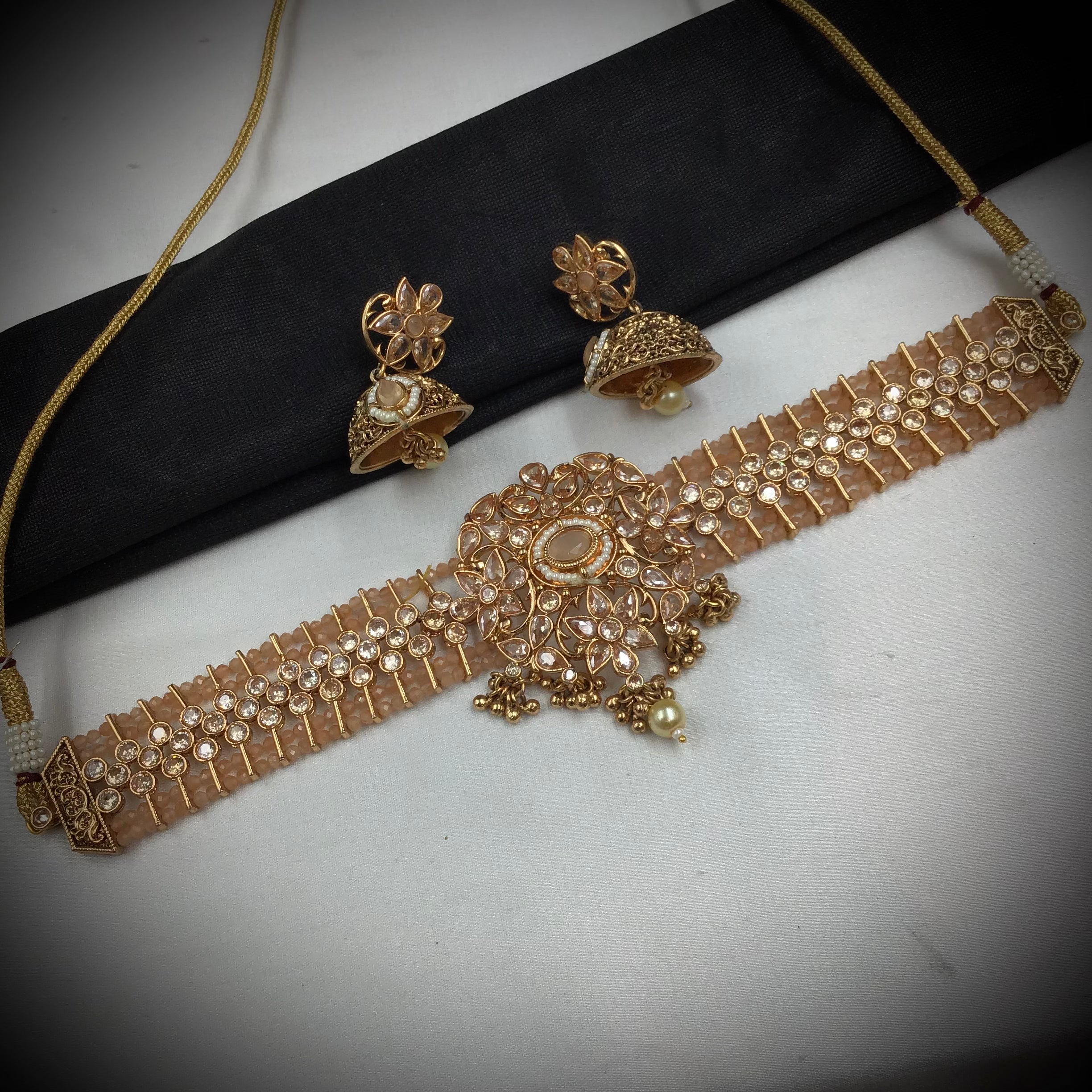 Our stunning Gold Look Choker, featuring delicate peach coloured beads that exude charm and elegance. The choker is designed with a unique style that is sure to make you stand out from the crowd, and features a peach stone and white beads in the center that adds a touch of sophistication to the overall design.