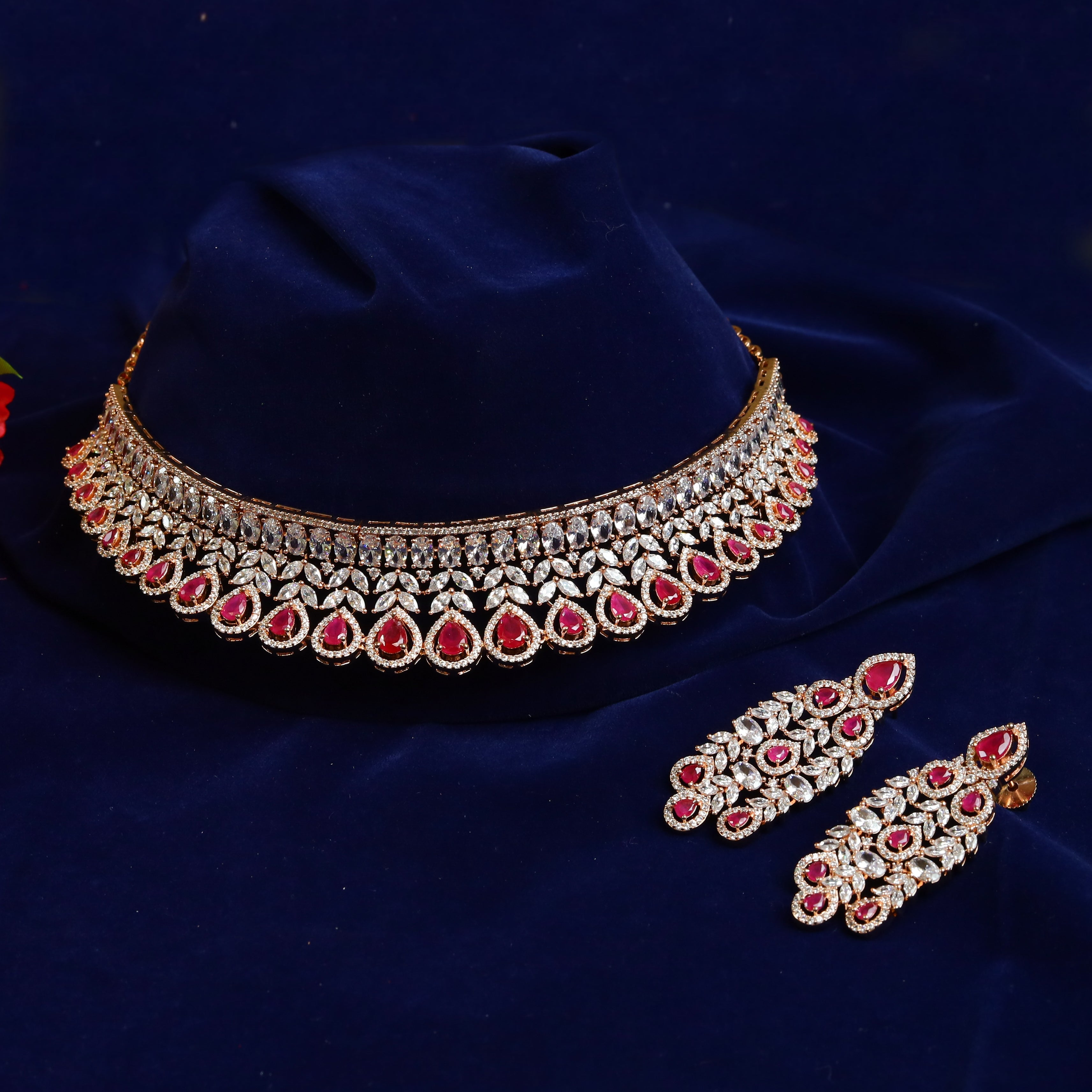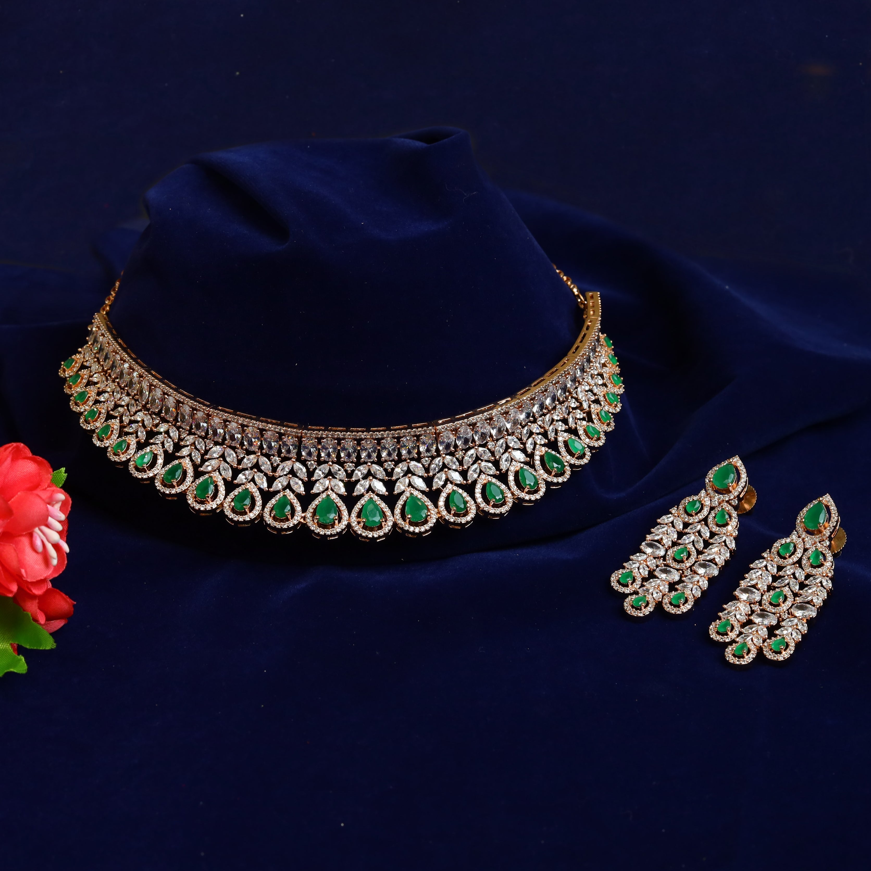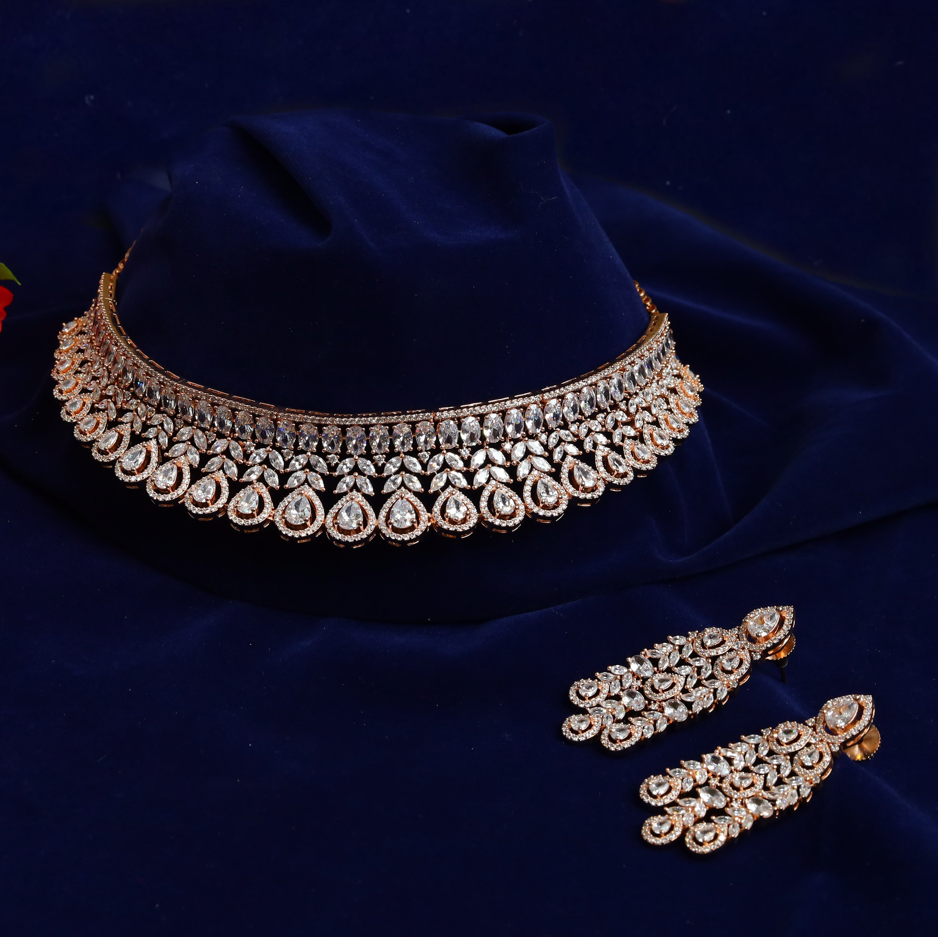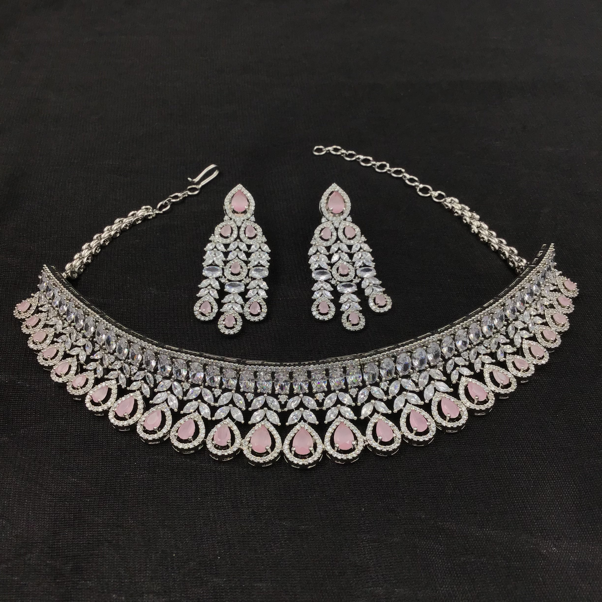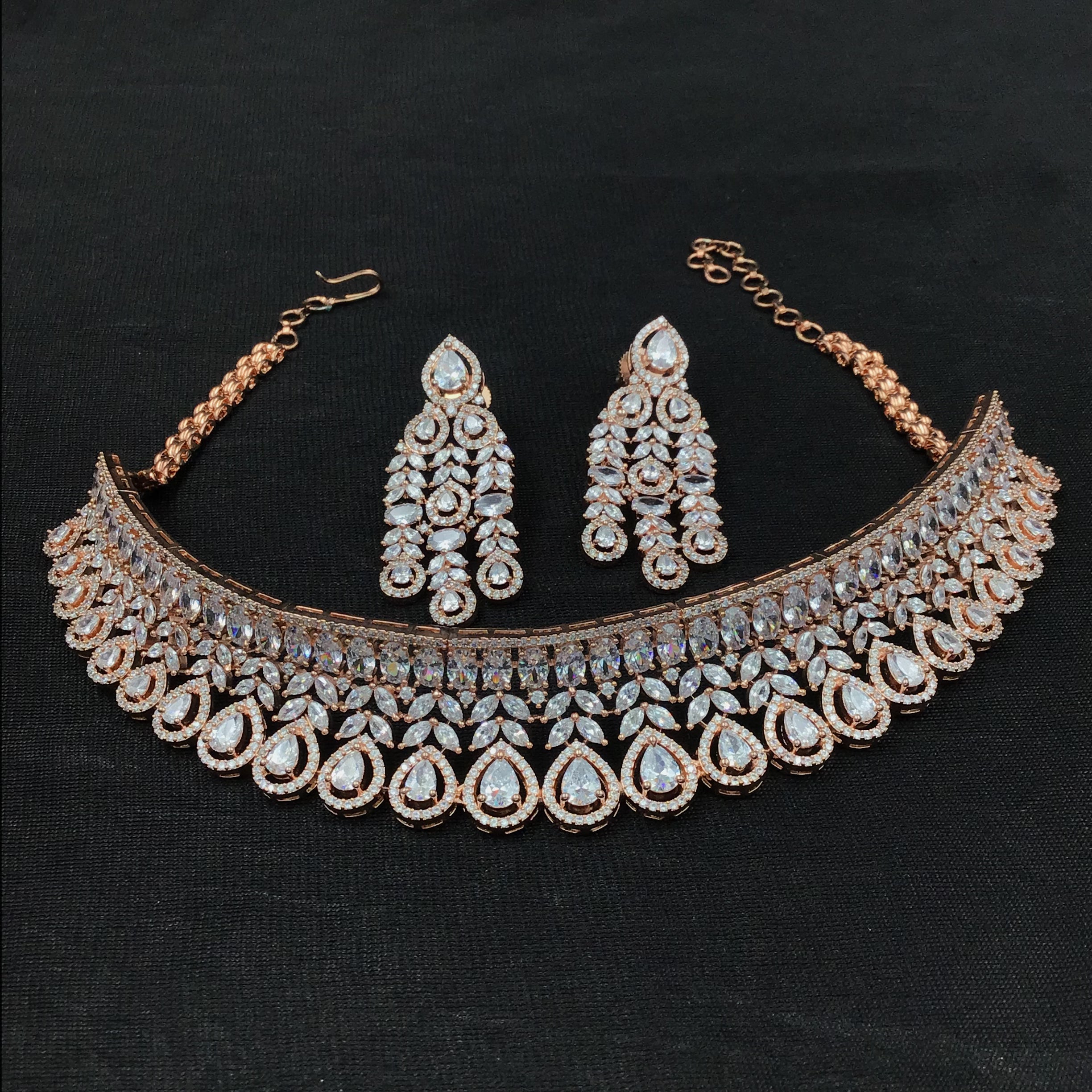Our elegant AD Choker Set, a perfect combination of beauty and grace. The choker boasts intricate detailing and fine craftsmanship, making it a stunning accessory for any occasion. Accompanying this exquisite choker is a set of lightweight earrings that add a touch of sophistication to your overall look. Embrace the comfort and charm of this set, and exude confidence wherever you go.