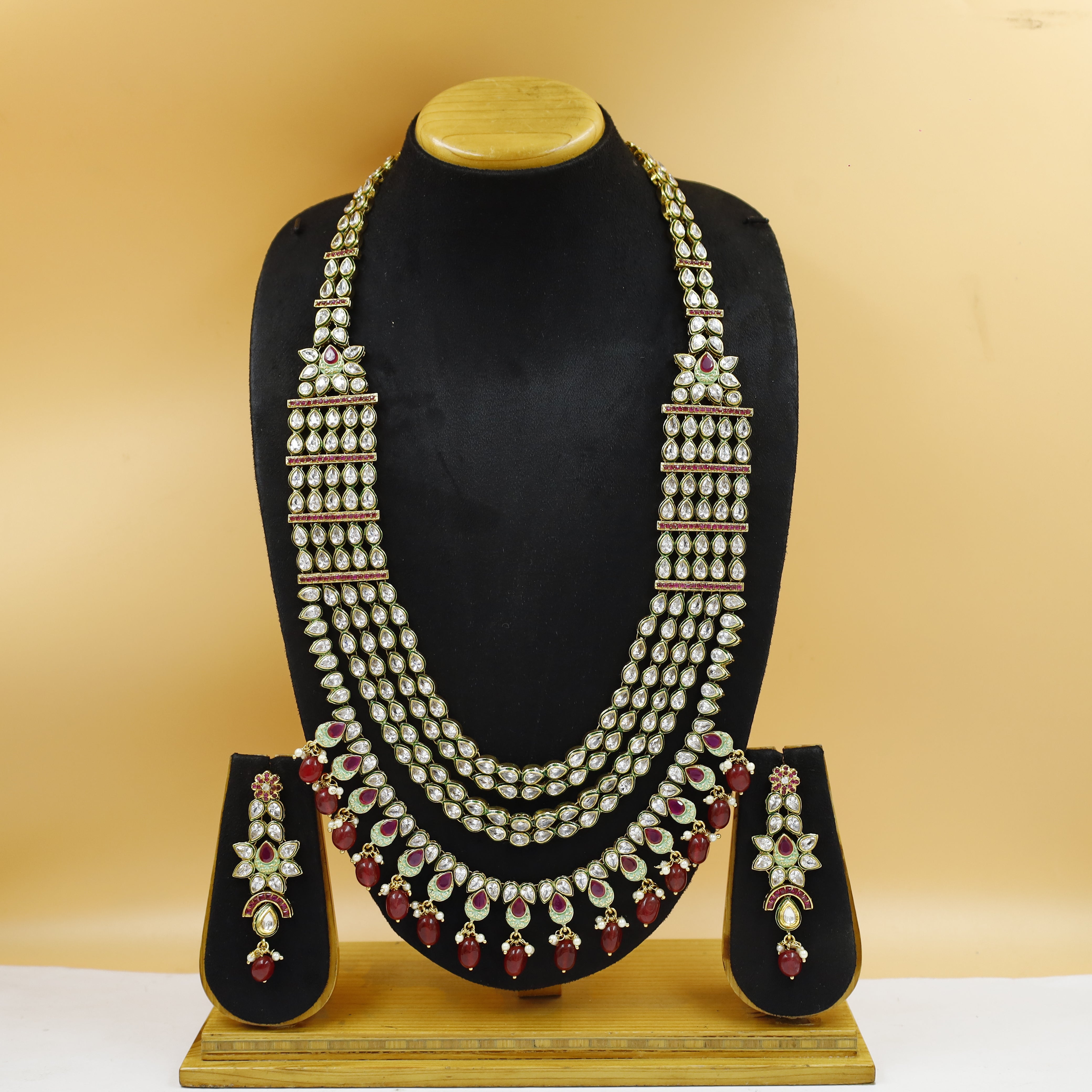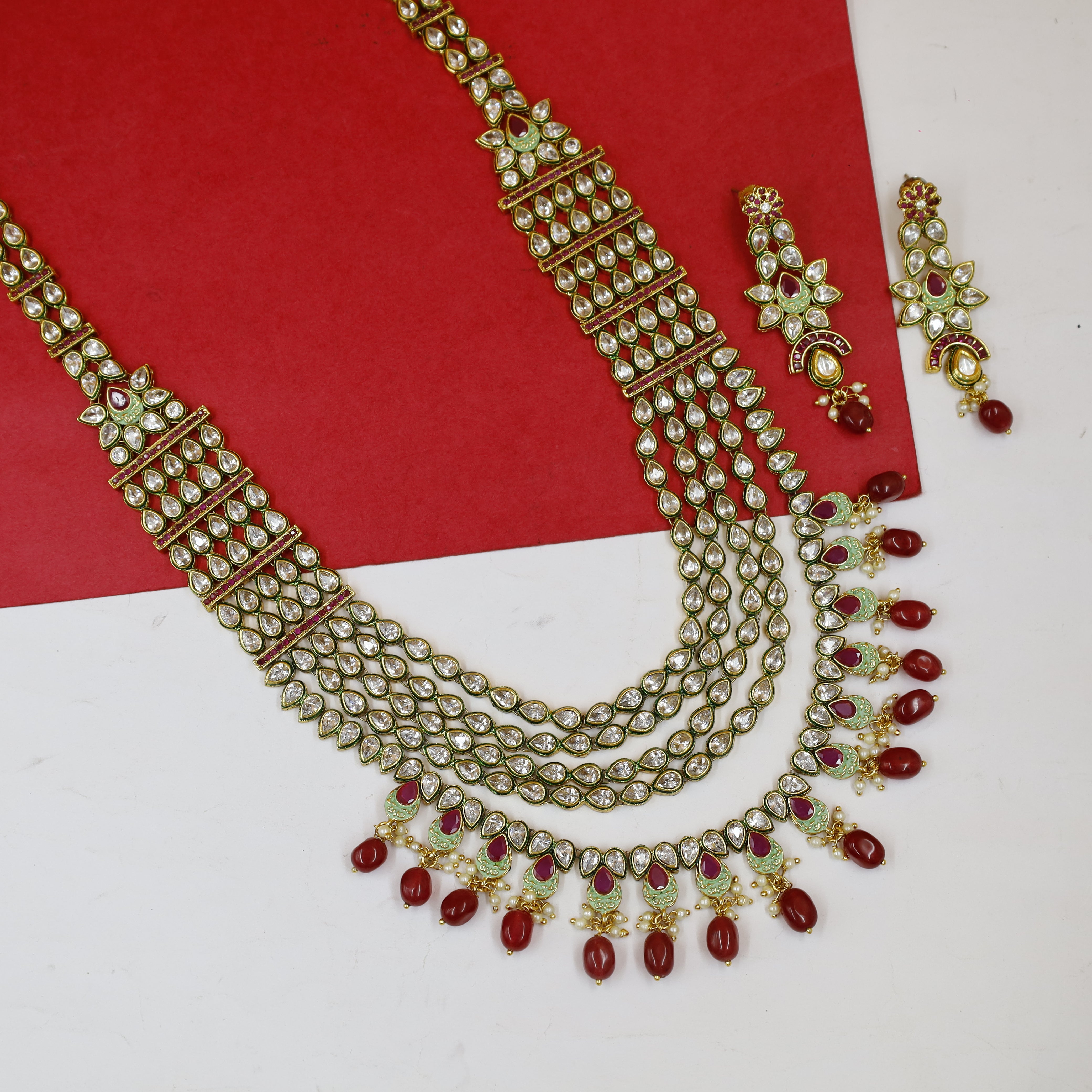 A long Kundan Polki necklace set with mint Meenakari and ruby-colored stones is a breathtaking work of art that beautifully combines traditional Indian craftsmanship with contemporary design elements. This exquisite jewelry set is a celebration of vibrant colors and intricate detailing.
