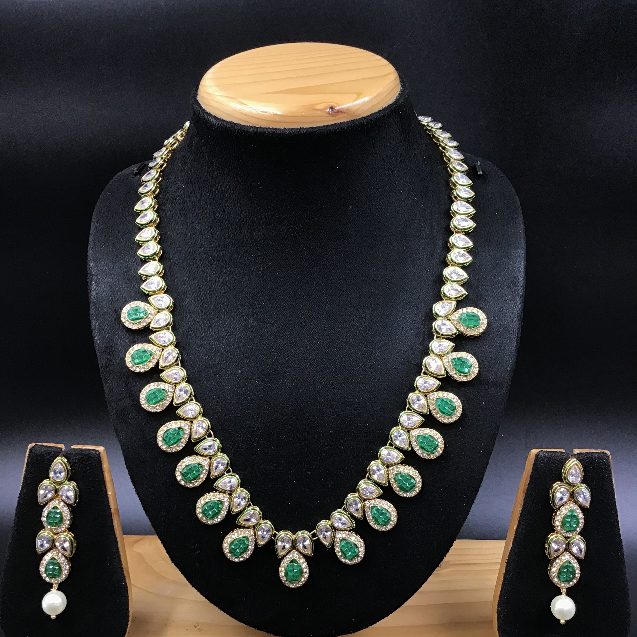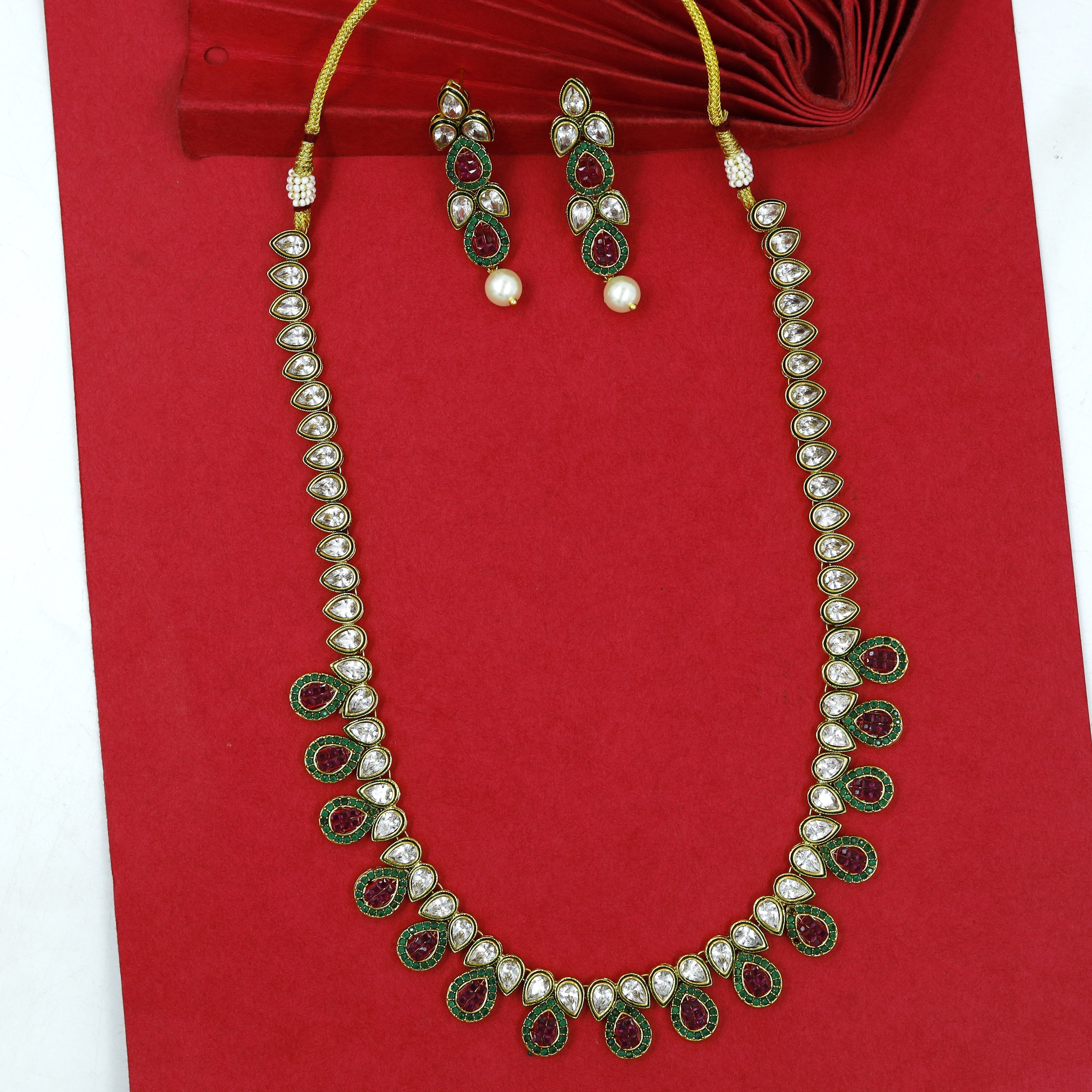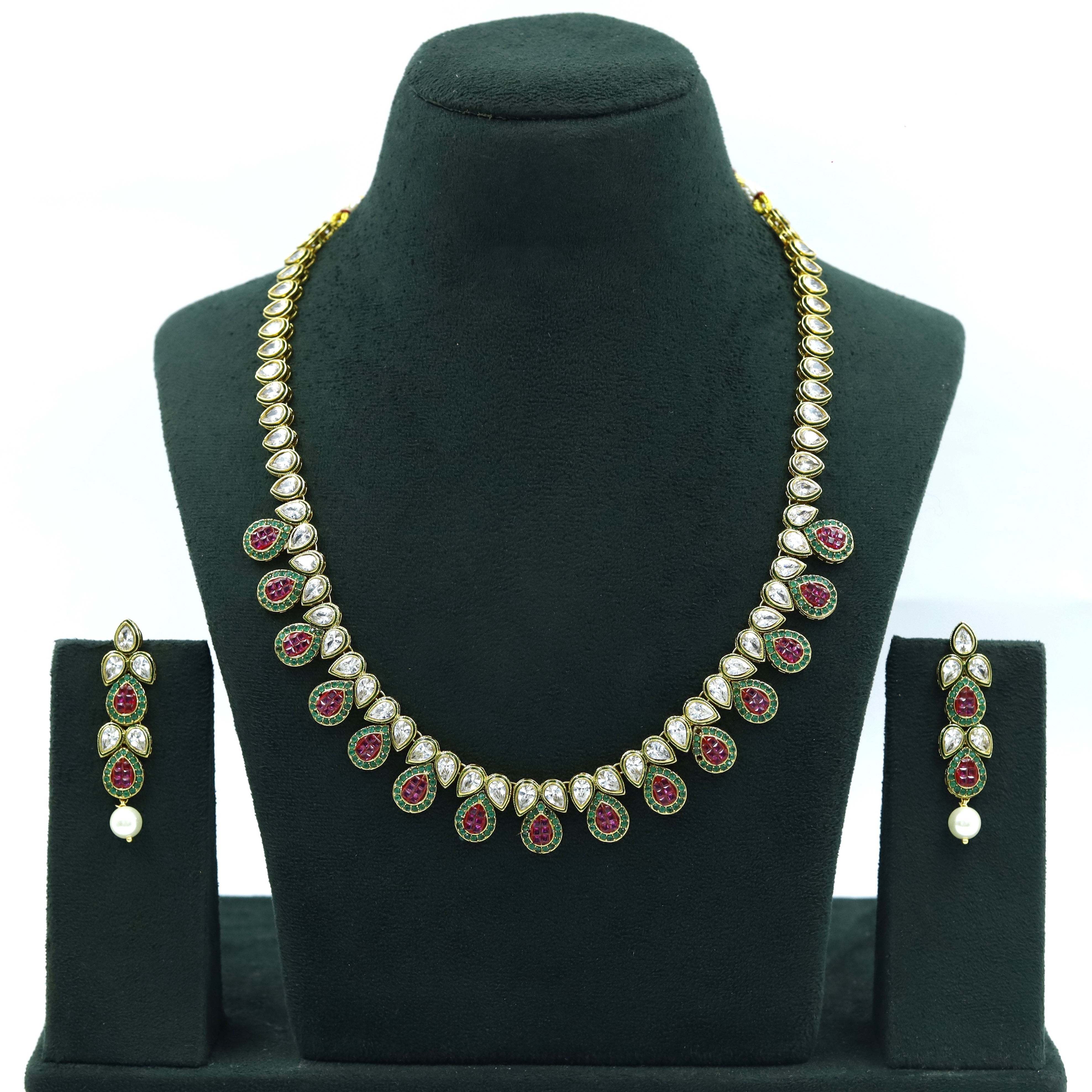 Our stunning Polki Necklace, a harmonious blend of classic charm and modern flair. This necklace showcases an intricate design crafted with small, shimmering beads and exquisite stones, creating a mesmerizing visual delight.The subtle yet captivating sparkle of the necklace is sure to enhance your natural beauty and add a touch of glamour to any outfit.