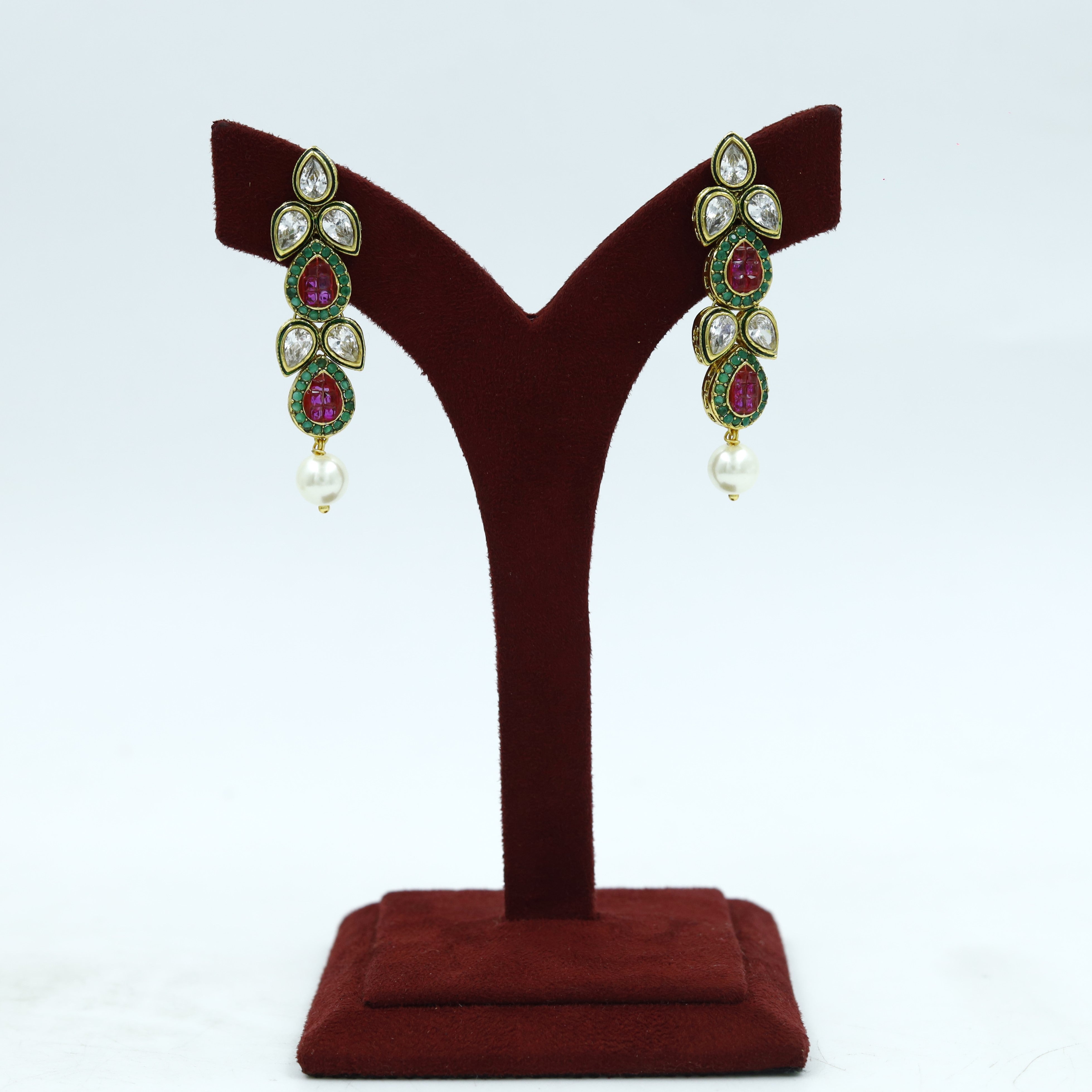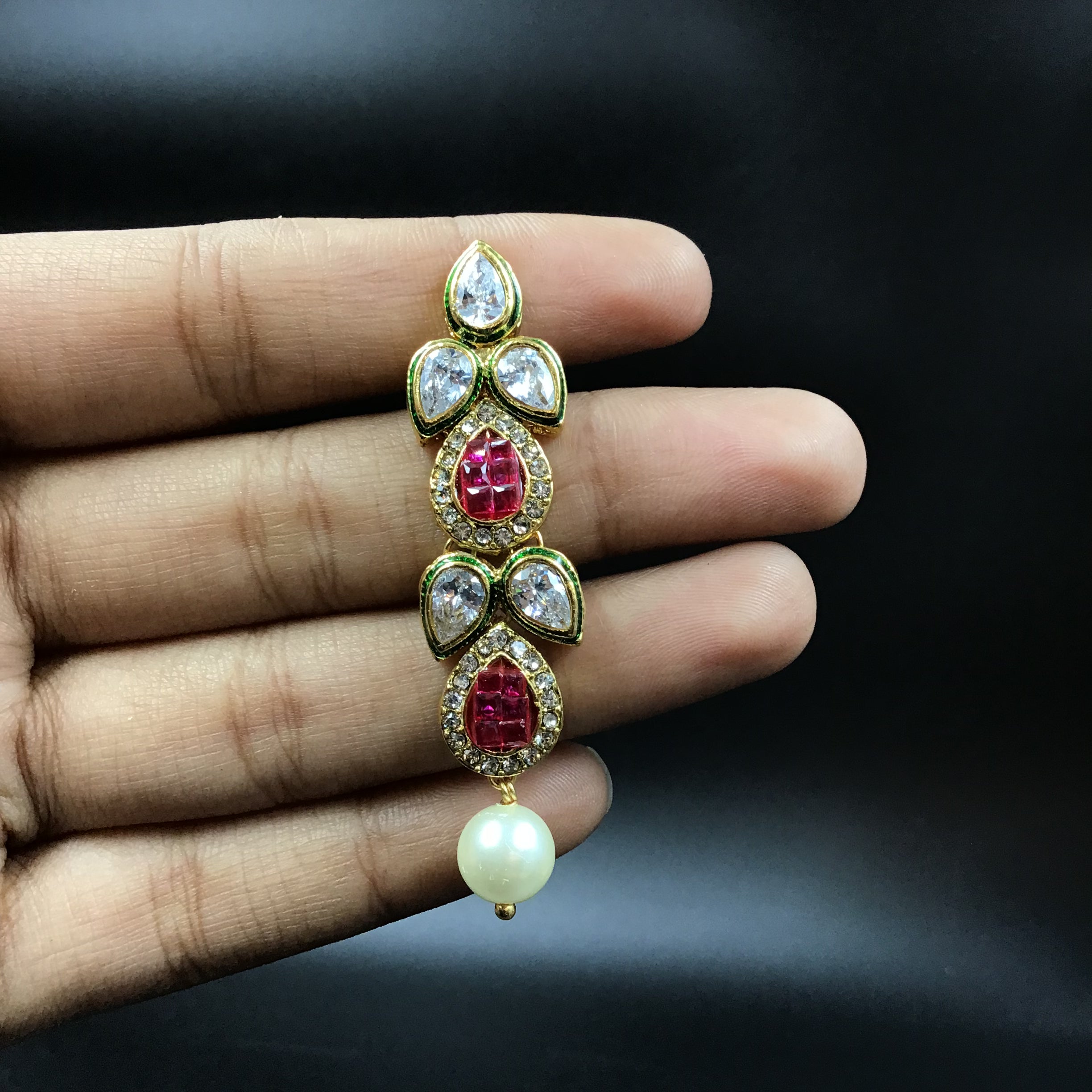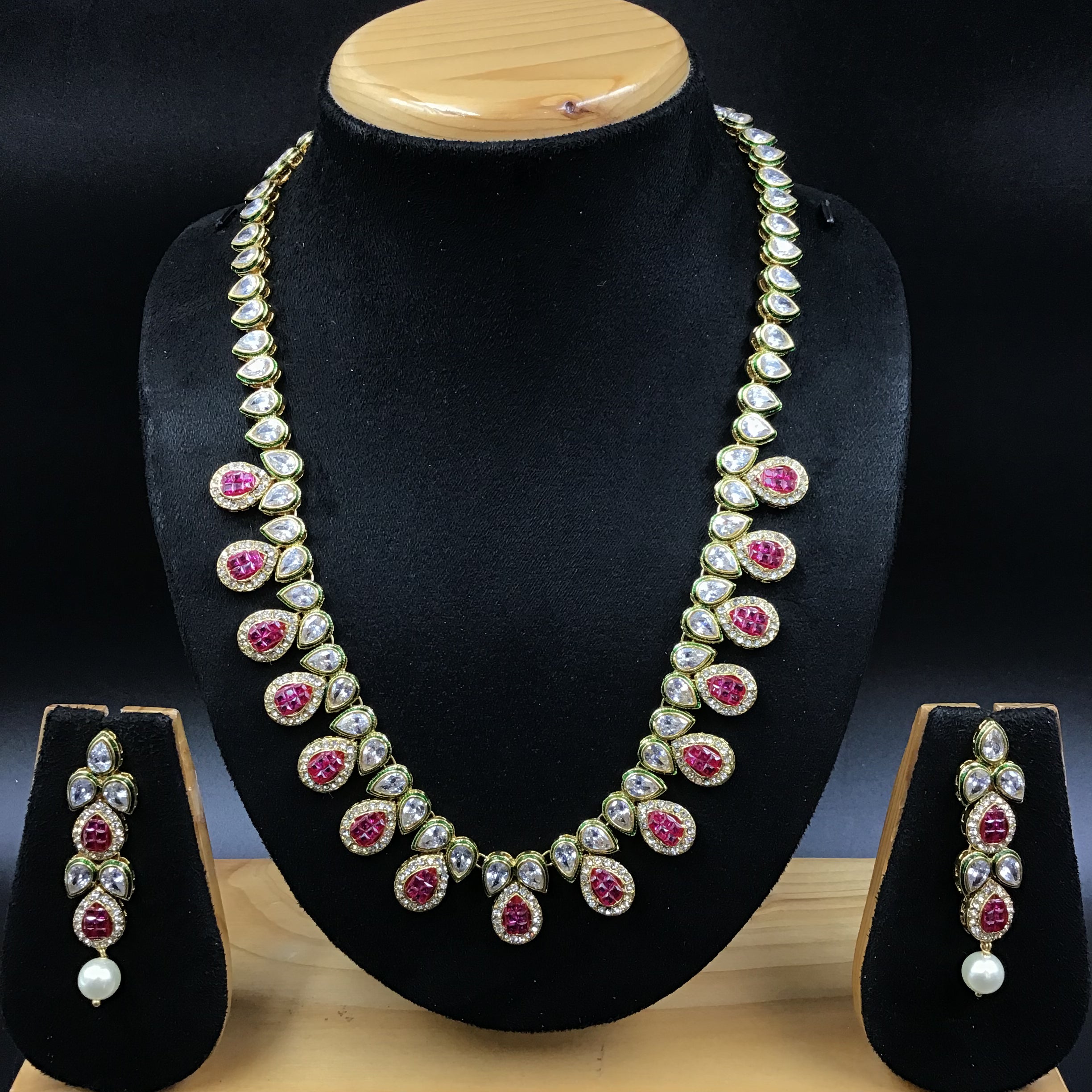 Our stunning Polki Necklace, a harmonious blend of classic charm and modern flair. This necklace showcases an intricate design crafted with small, shimmering beads and exquisite stones, creating a mesmerizing visual delight.The subtle yet captivating sparkle of the necklace is sure to enhance your natural beauty and add a touch of glamour to any outfit.