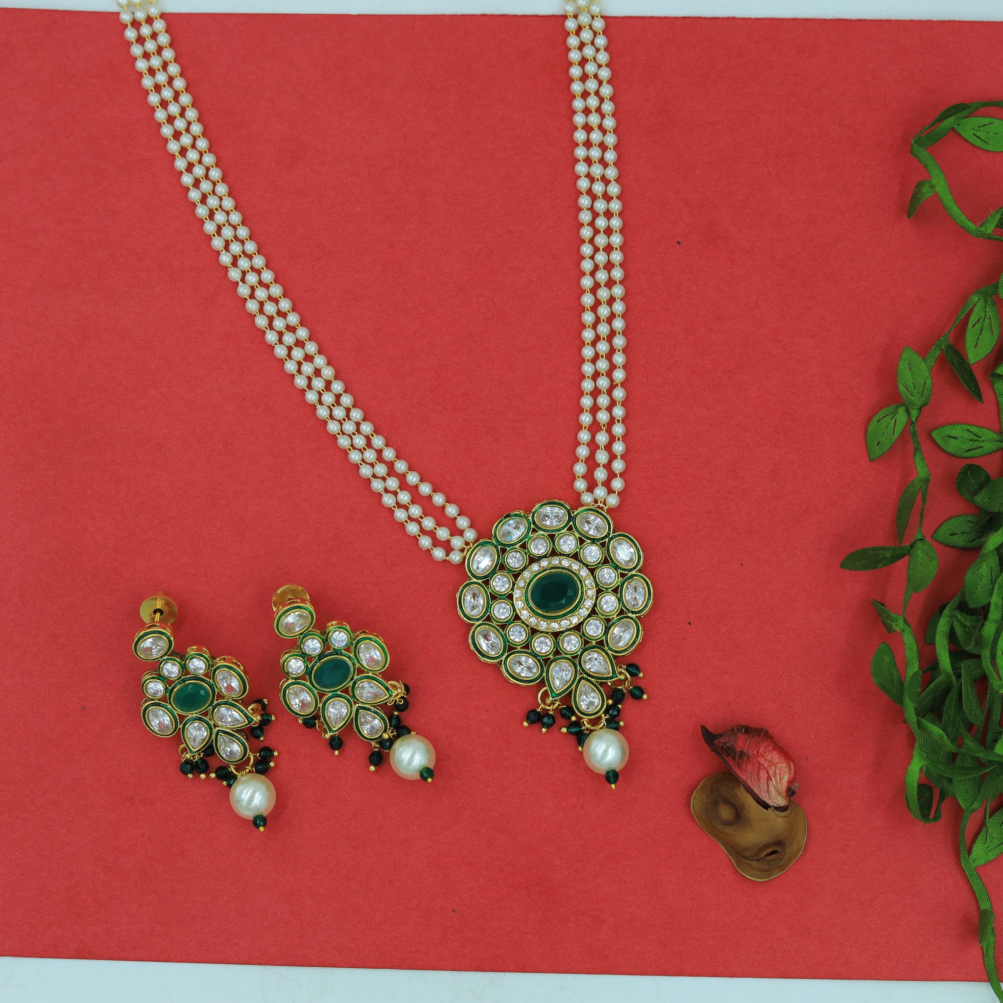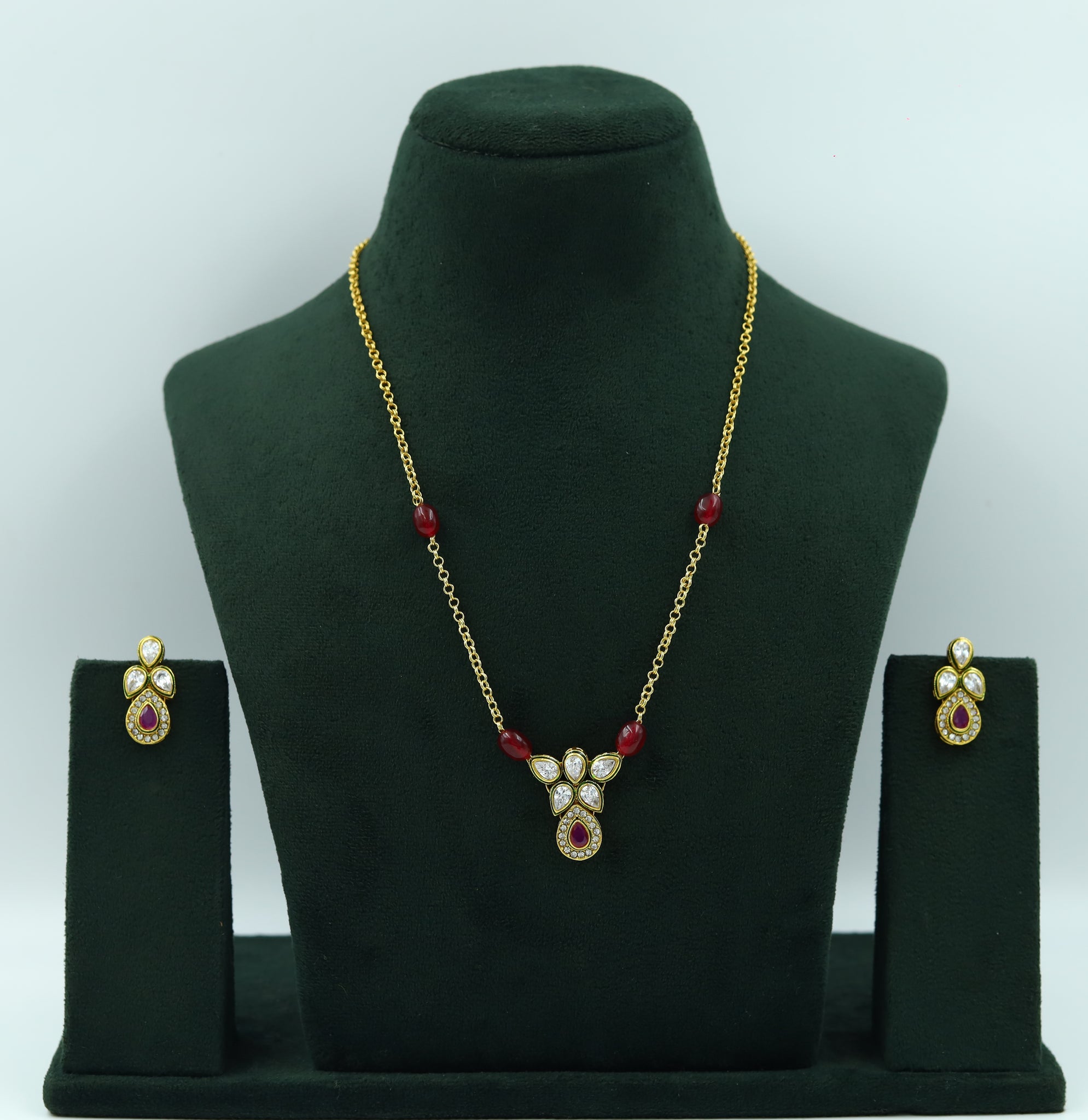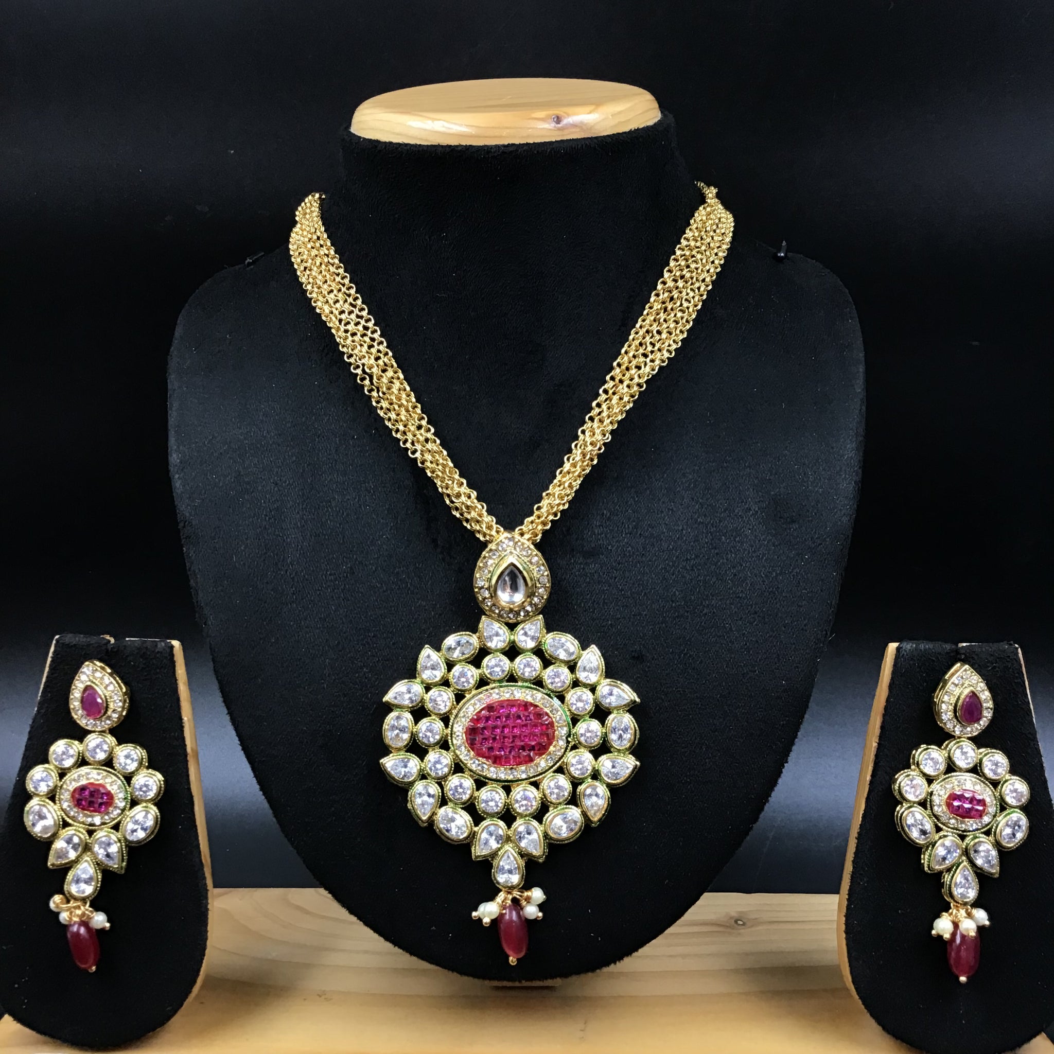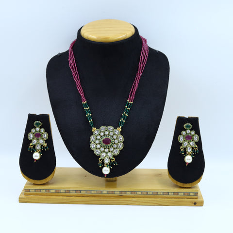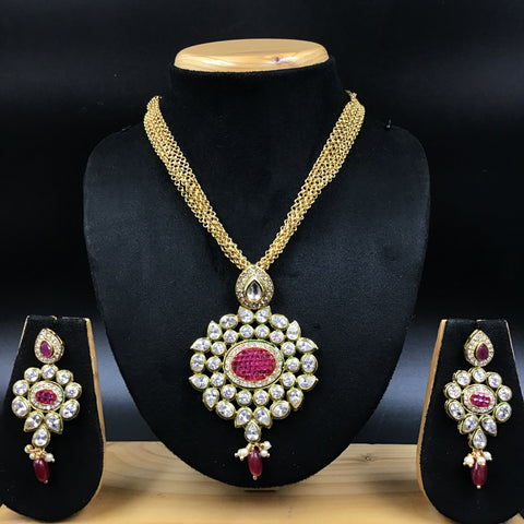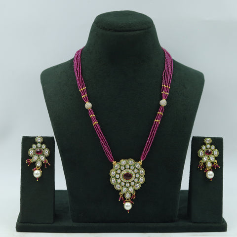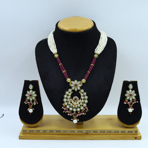 Stone - Polki, Ruby, PearlPendant Closure - Chain HookEarring Closure - Push BackBase - Silver & Copper AlloySet Contains - 1 Pendant + 2 Earrings Earrings Height - 4.5 CM, Width - 1 CM Earrings Weight...