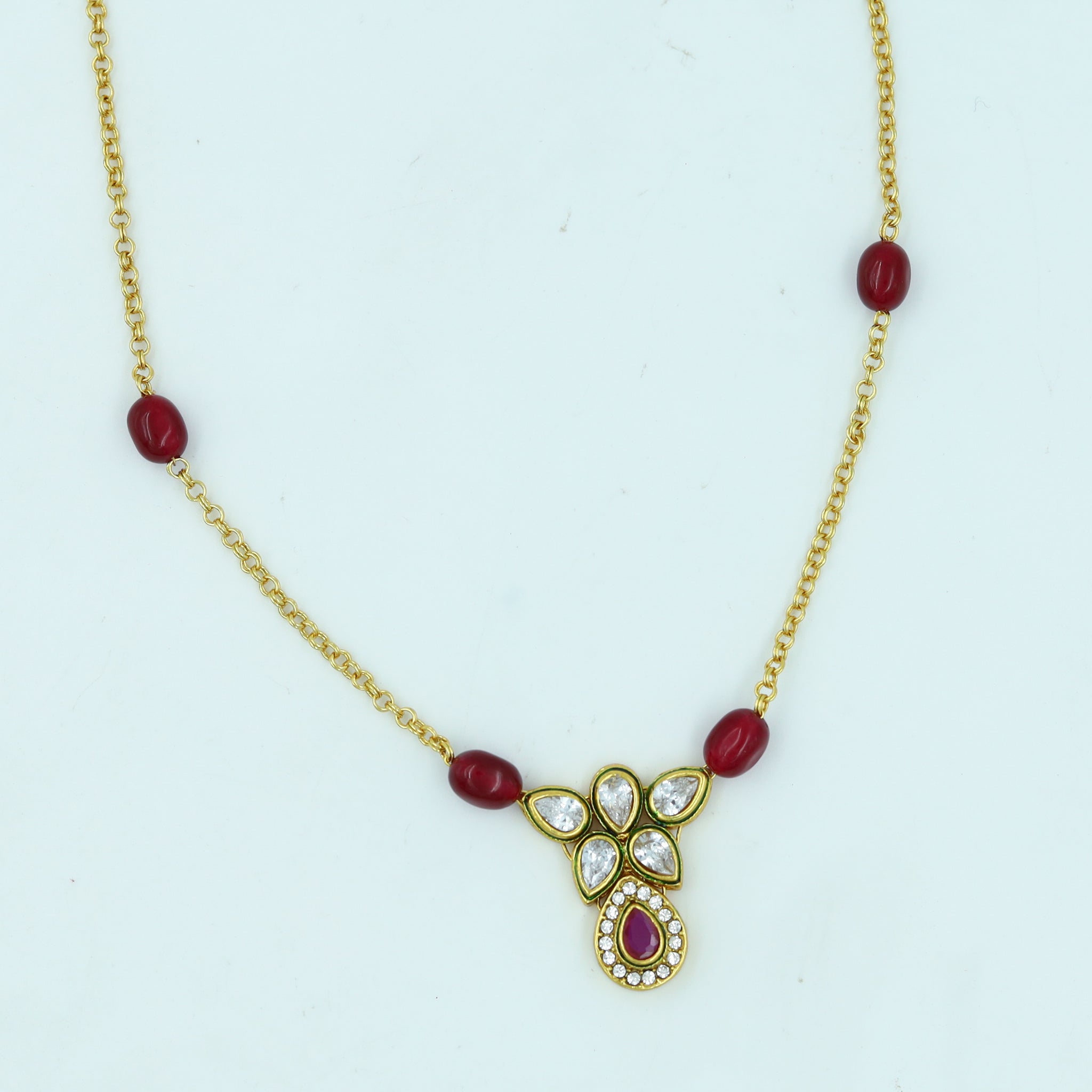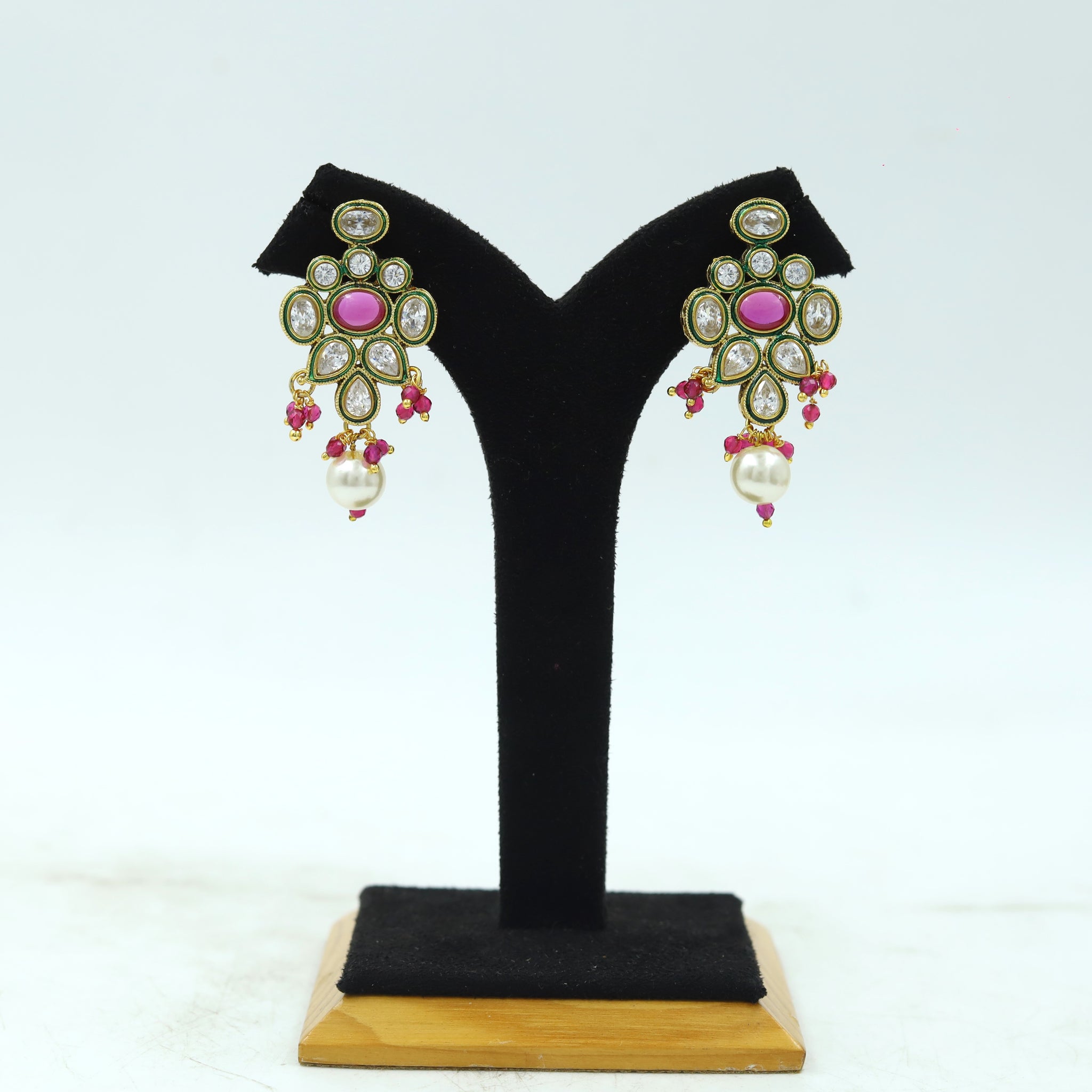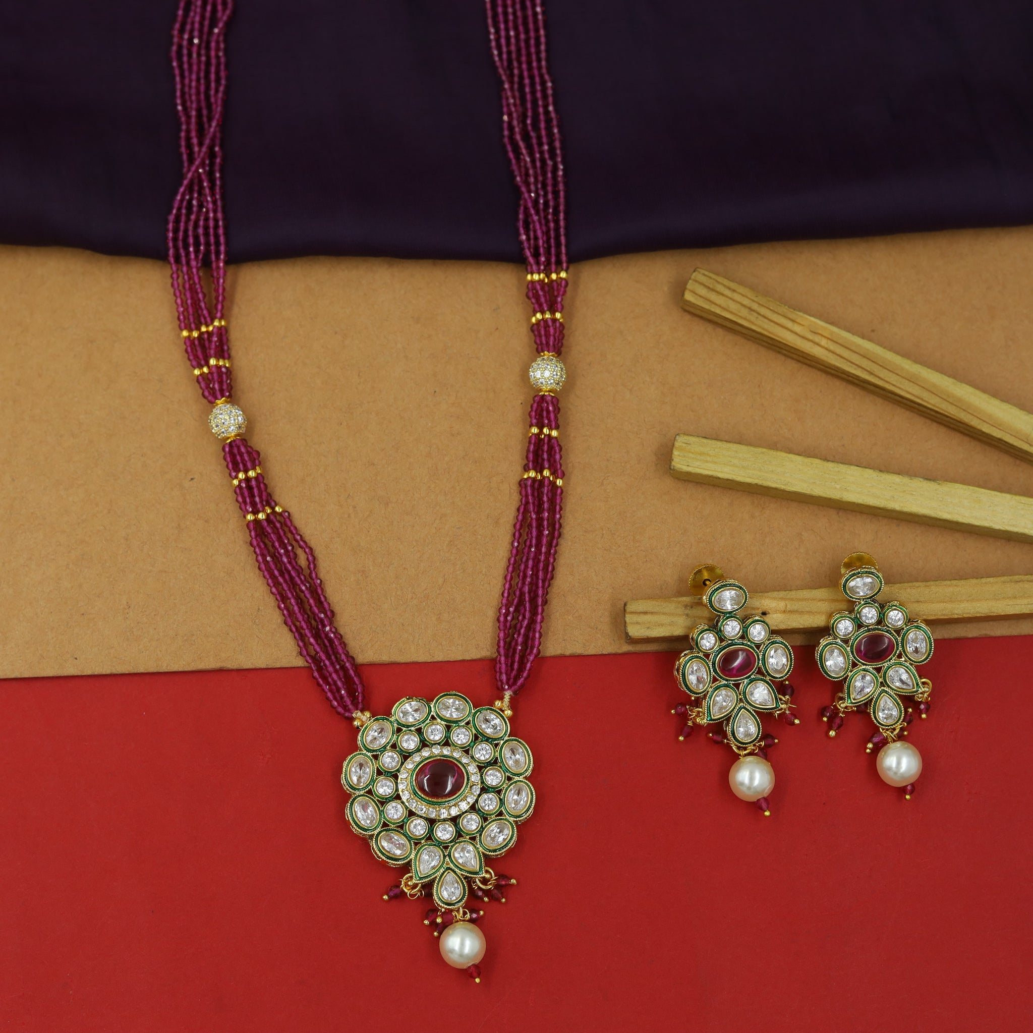 Stone - Polki, Ruby, PearlPendant Closure - Chain HookEarring Closure - Push BackBase - Silver & Copper AlloySet Contains - 1 Pendant + 2 Earrings Earrings Height - 4.5 CM, Width - 1 CM Earrings Weight...