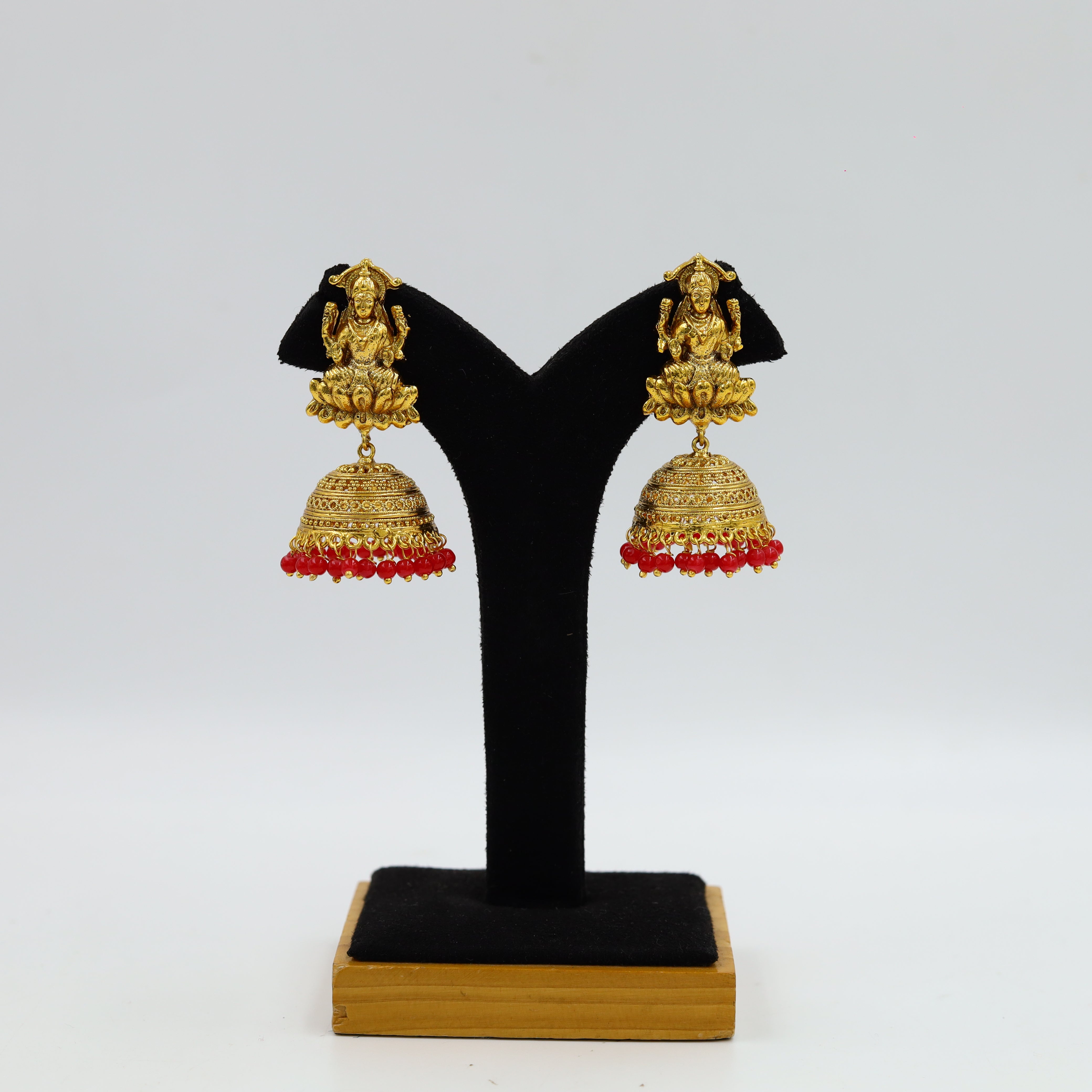 jhumkis feature intricate temple work that highlights the beauty of Indian jewelry. The use of high-quality ruby pearls creates a beautiful contrast against the gold polish finish, adding an element of grace and sophistication.