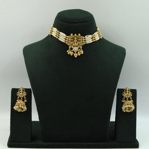 Base - Silver & Copper AlloySet Contains -1 Necklace + 2 EarringsNecklace Closure - Silk DoriEarring Closure - Push Back The exquisite Gold Look Pendant featuring a beautiful image of Lord Krishna and Radha. The...
