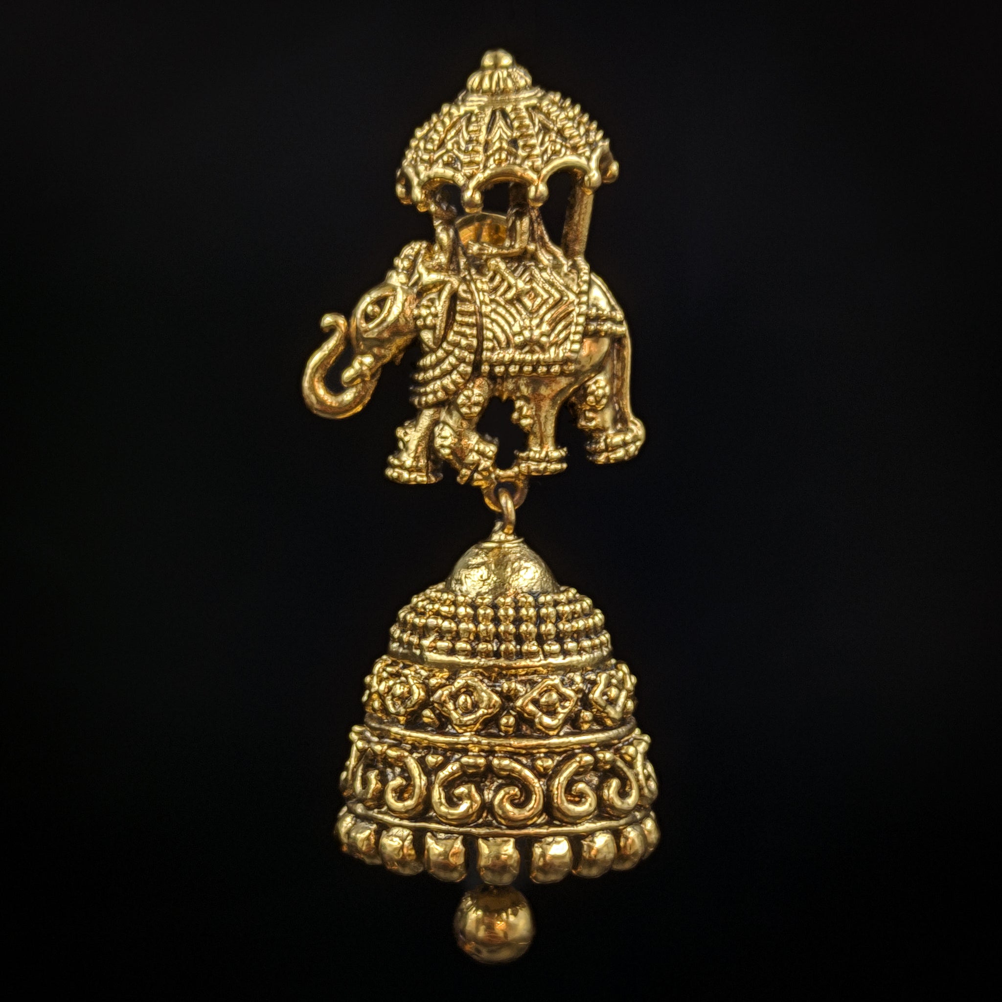 Our stunning Gold Look Jhumki earrings, perfect for adding a touch of elegance to any outfit! These earrings feature a beautiful antique gold look with intricate golden beads and a charming elephant design.