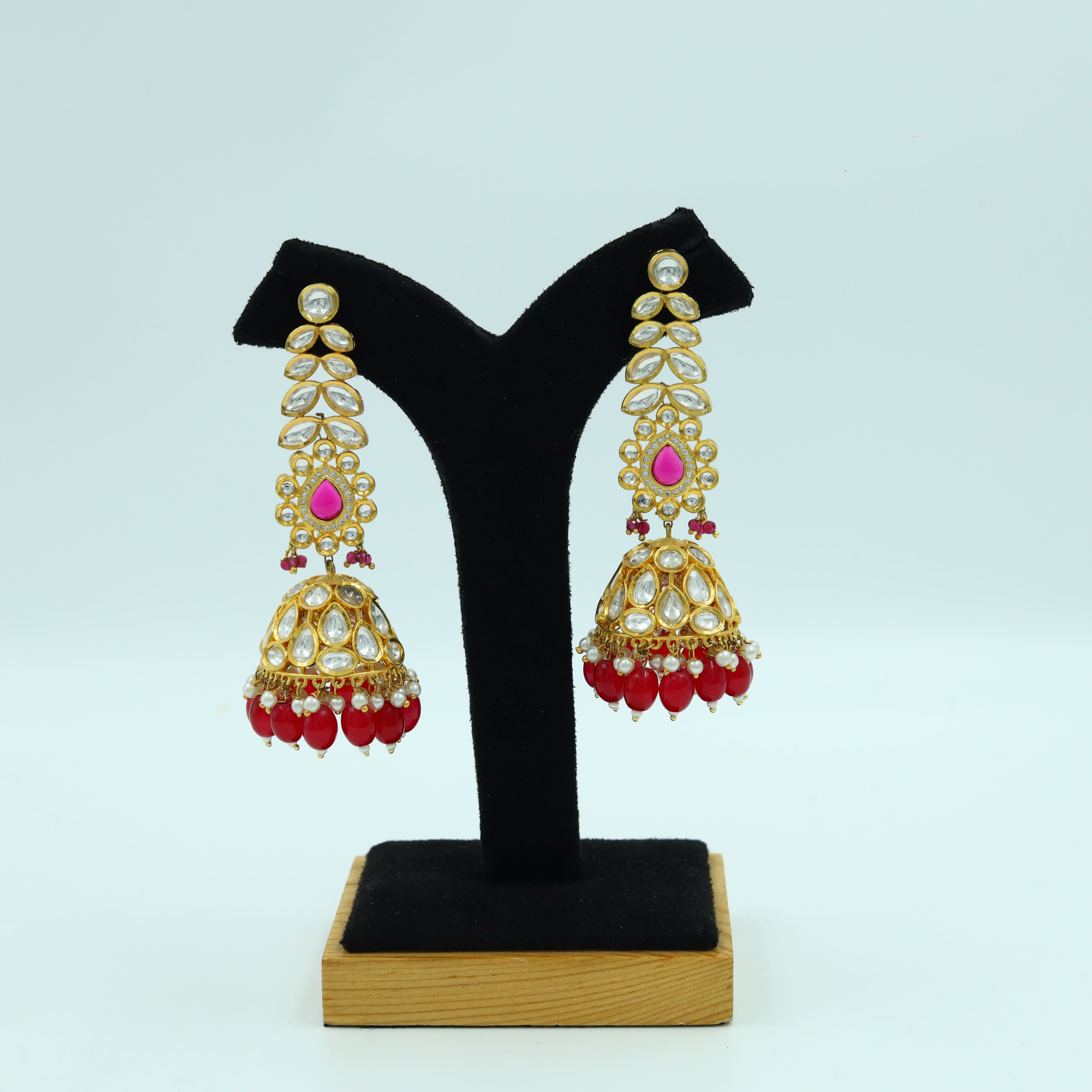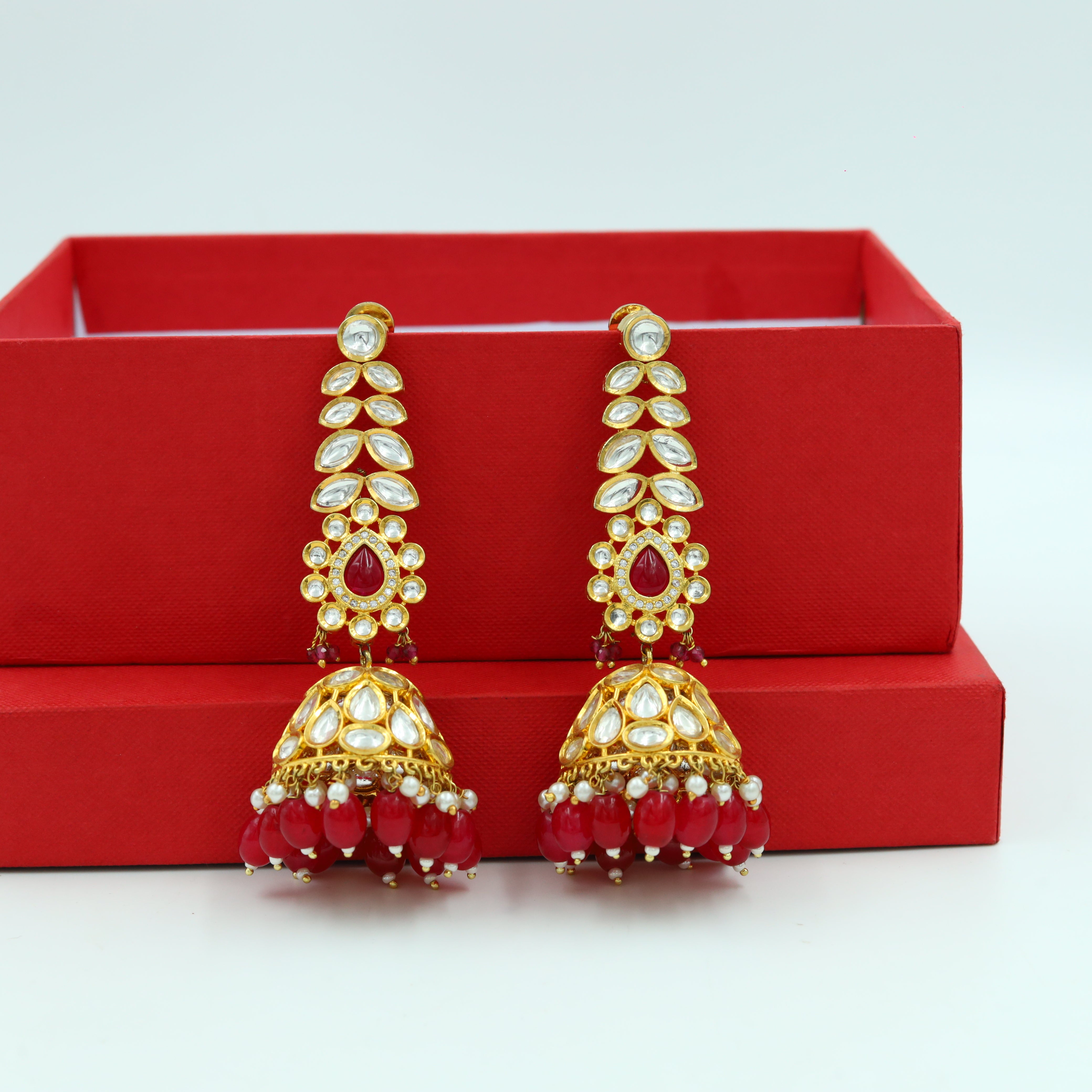 Crafted with the finest quality materials, these jhumkis feature a beautiful Kundan design with intricate detailing that exudes luxury and sophistication. The ruby stones and white pearls embedded on the jhumkis add a touch of elegance and charm, making them perfect for any occasion.