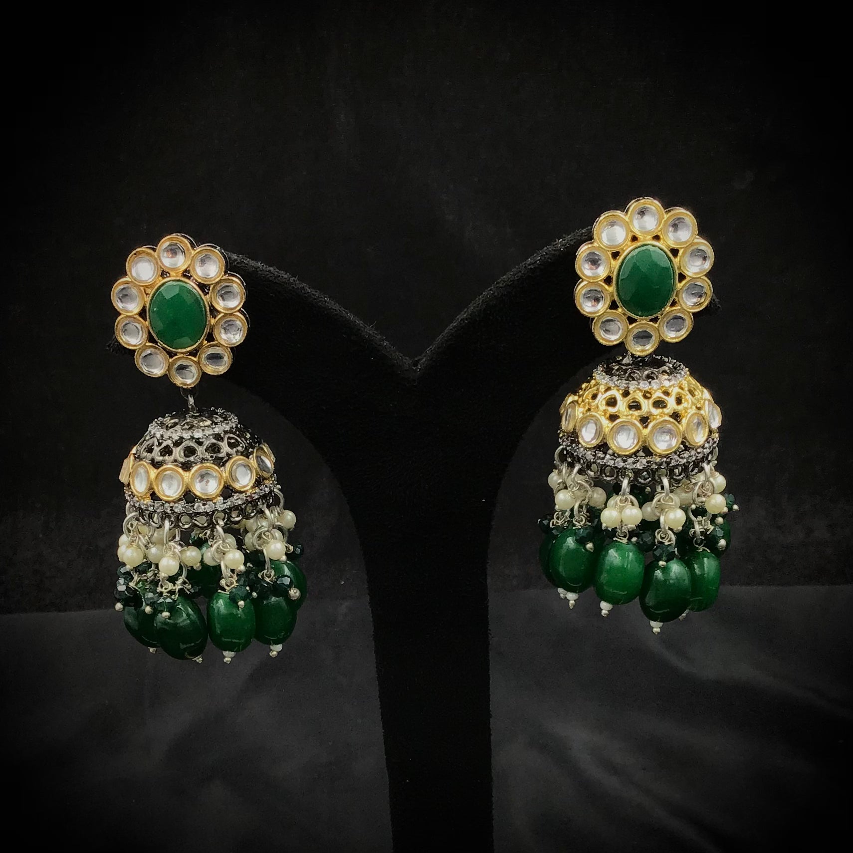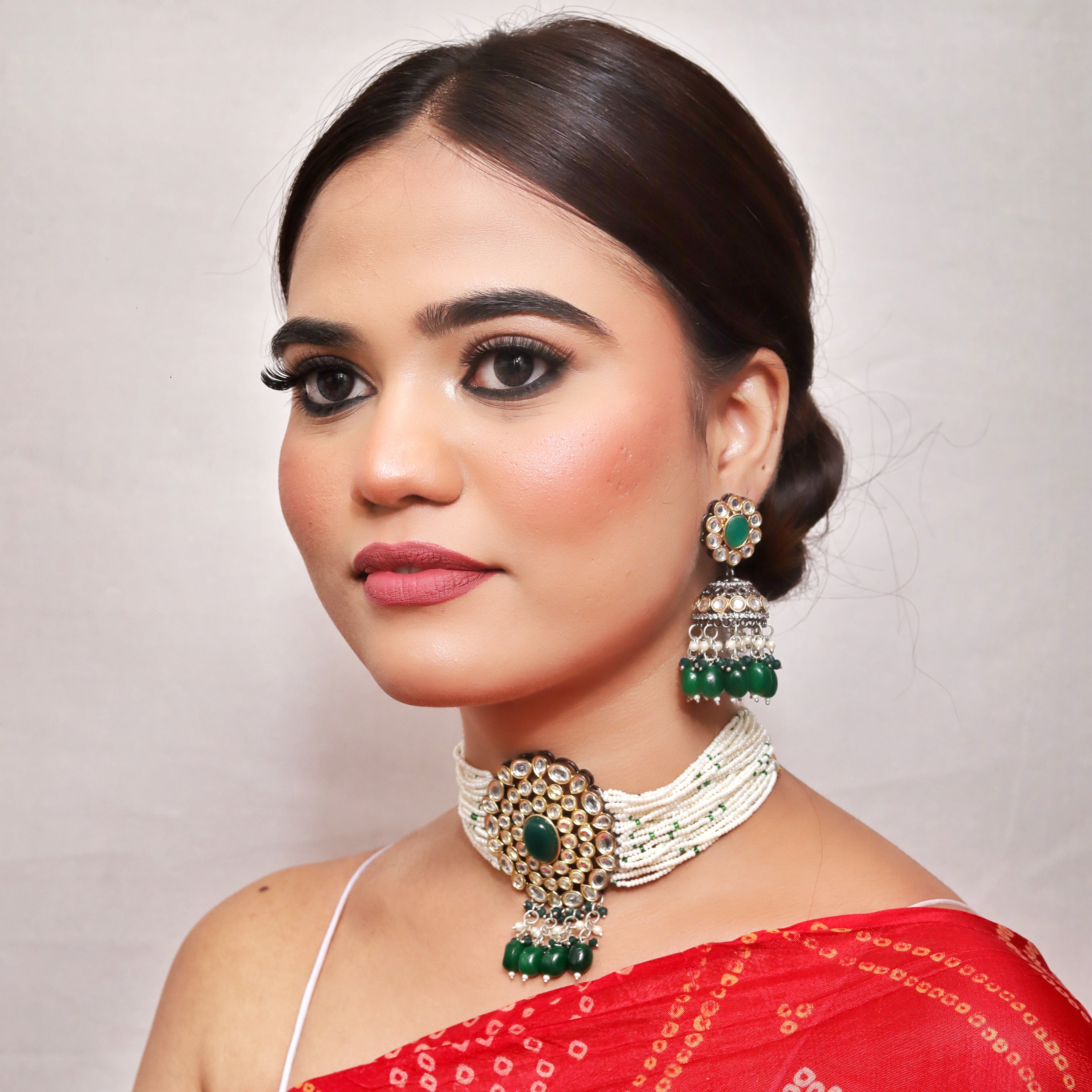 This exquisite choker features a delicate arrangement of small white beads, creating a captivating backdrop for the intricate Kundan work.The chandbali design, with its crescent shape and intricate details, adds a regal touch, while the jhumki adds movement and a hint of playfulness to the earrings.This Kundan Necklace and earring set is perfect for weddings, festive occasions, or cultural celebrations.