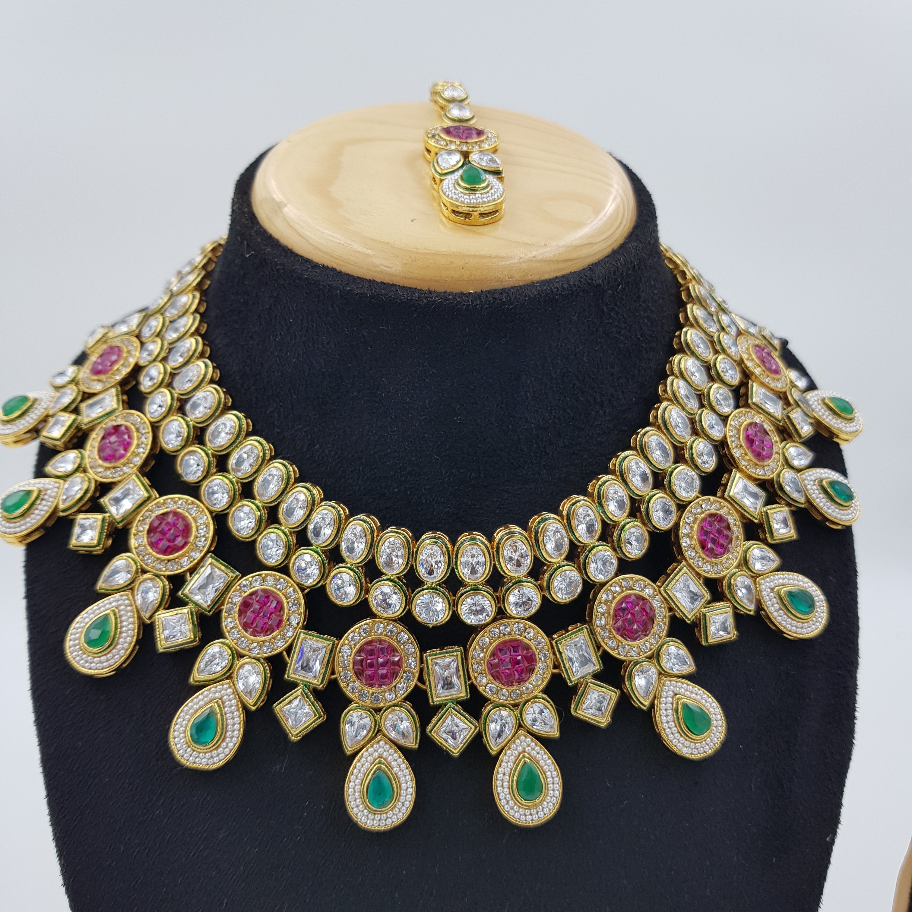 This stunning necklace features small-sized stones and beads, intricately arranged to create a captivating and intricate design. Complete your look for any special event with this necklace, as it adds a touch of elegance and charm that will undoubtedly turn heads. The set comes with beautiful, lightweight earrings and a matching maang tikka, ensuring a perfectly coordinated and graceful ensemble.